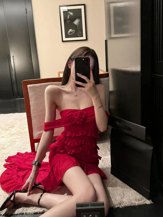 maoxiangshop Summer Chiffon Irregular Red Split Dress Sexy Sleeveless Fashion Even Party Dress Wedding French Elegant Slim Dress Woman