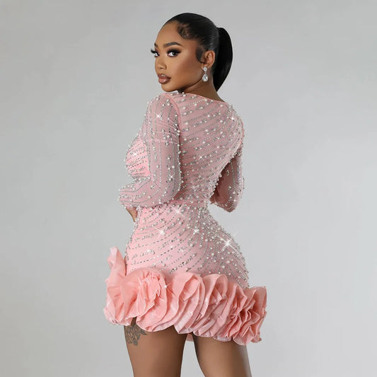 maoxiangshop Long Sleeve V Neck Transparent Club Dress Sexy Glittering Diamonds Dress Women Party Birthday Bodycon Mini Dresses Vestidos