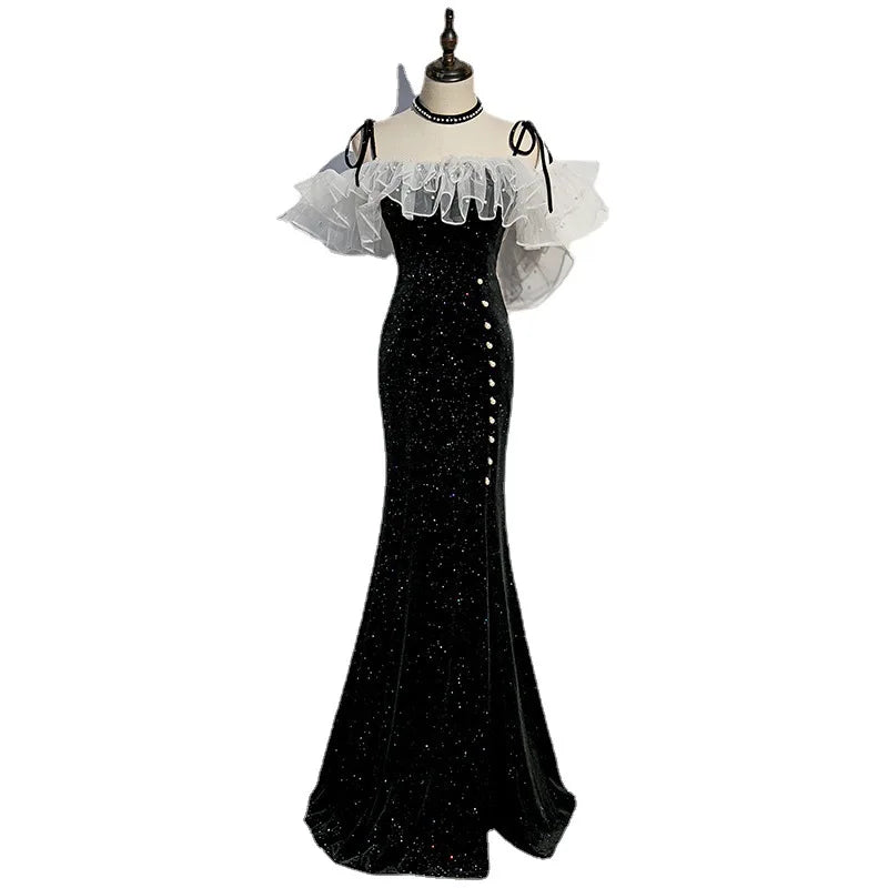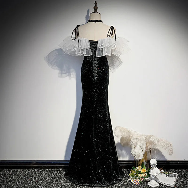 maoxiangshop Sparkling Black Satin Mermaid Evening Dress with Spaghetti Strap Organza Ruffled Slim Fitting Sexy Leg Split Prom Gown
