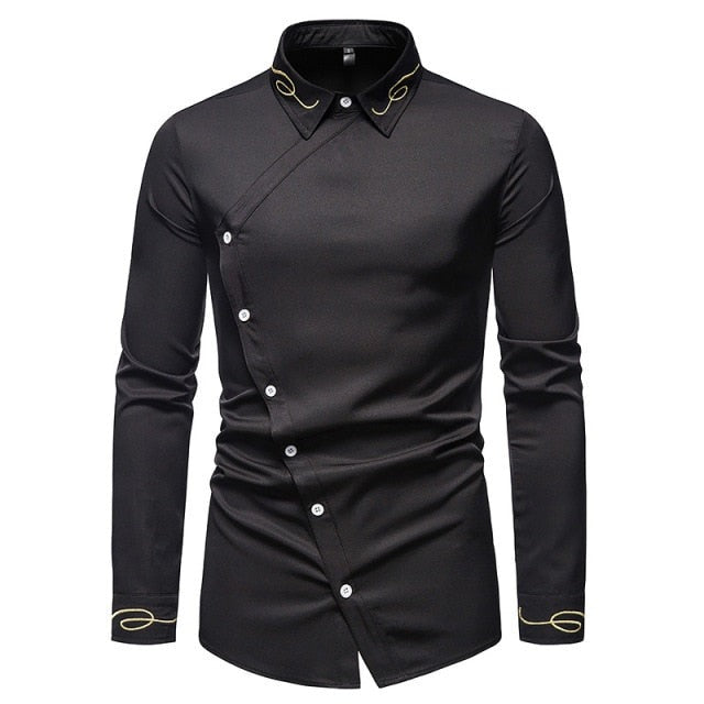 New Hollow European Size Men's Trend Embroidered Asymmetric Long-sleeved Shirt Western Denim Shirt Slim Fit Social Dress
