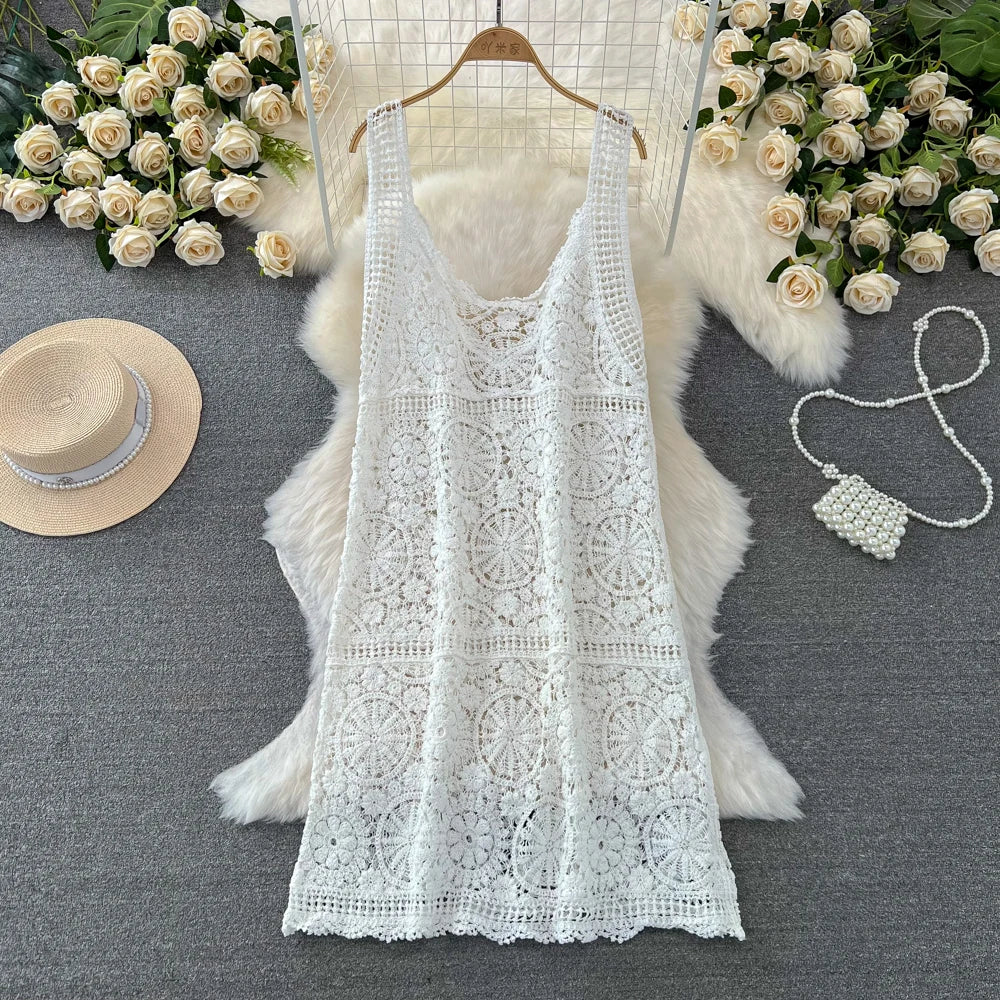 maoxiangshop Bohemian Beach Style Summer Dress Women Crochet Hollow Out Female Dresses Spaghetti Strap Sleeveless Vestidos De Mujer