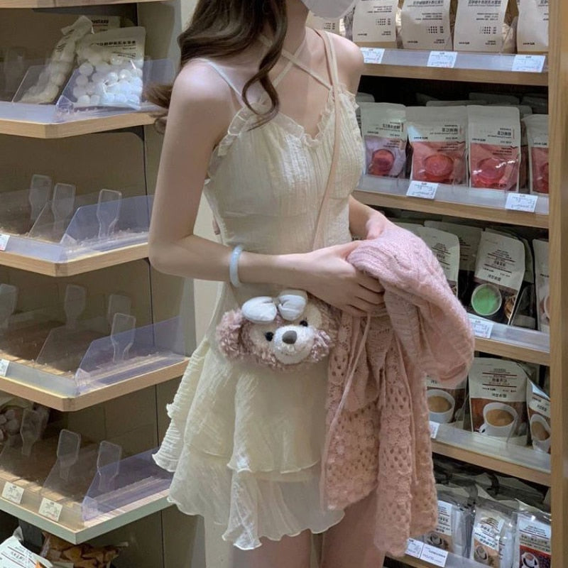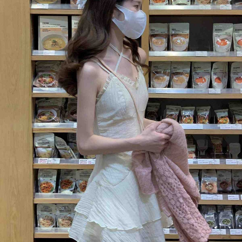 maoxiangshop Korean Style Fairycore Beige Mini Dress Women Y2k One Piece Tunic Halter Dresses Sweet Ruffle Lolita Vestidos Summer