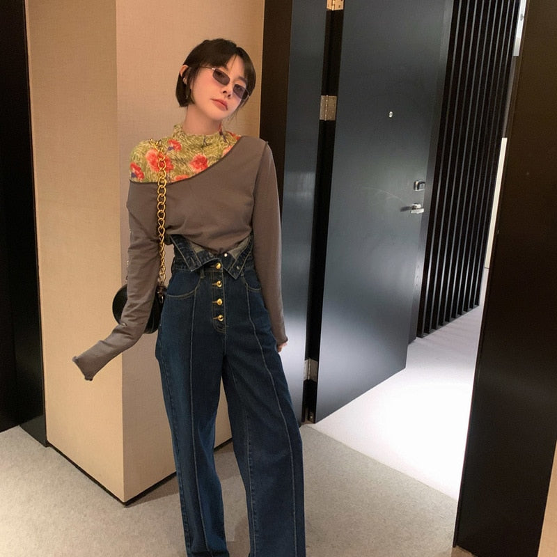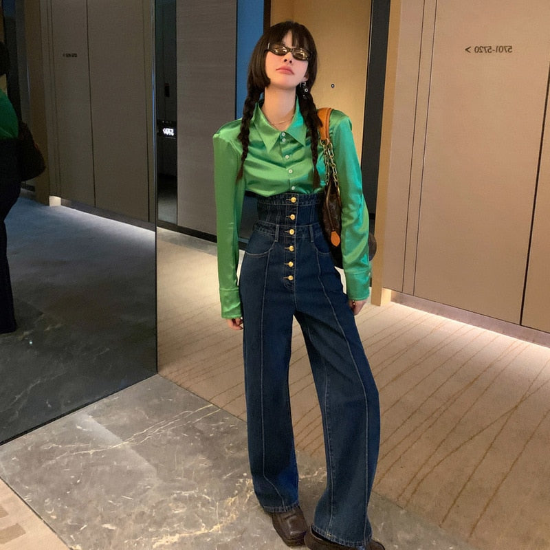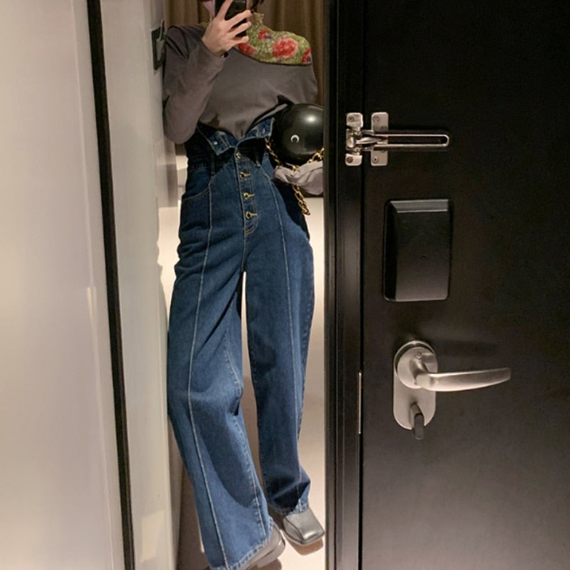 maoxiangshop Elegant Korean Jeans Women Winter New High-Waist French Designer Wide-legged Pants Blue Casual Designer Long Pants Autumn