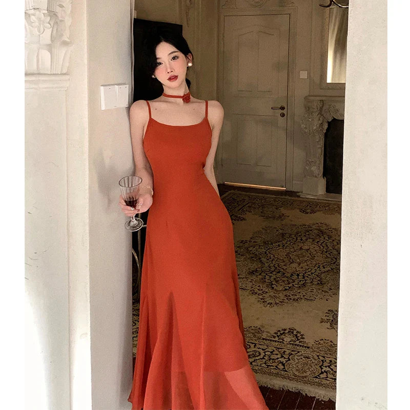maoxiangshop Elegant Long Dress Women Summer Vintage Solid Sleeveless Ruffles Spaghetti Strap Vestidos Female New Fashion Mermaid Robe Mujers