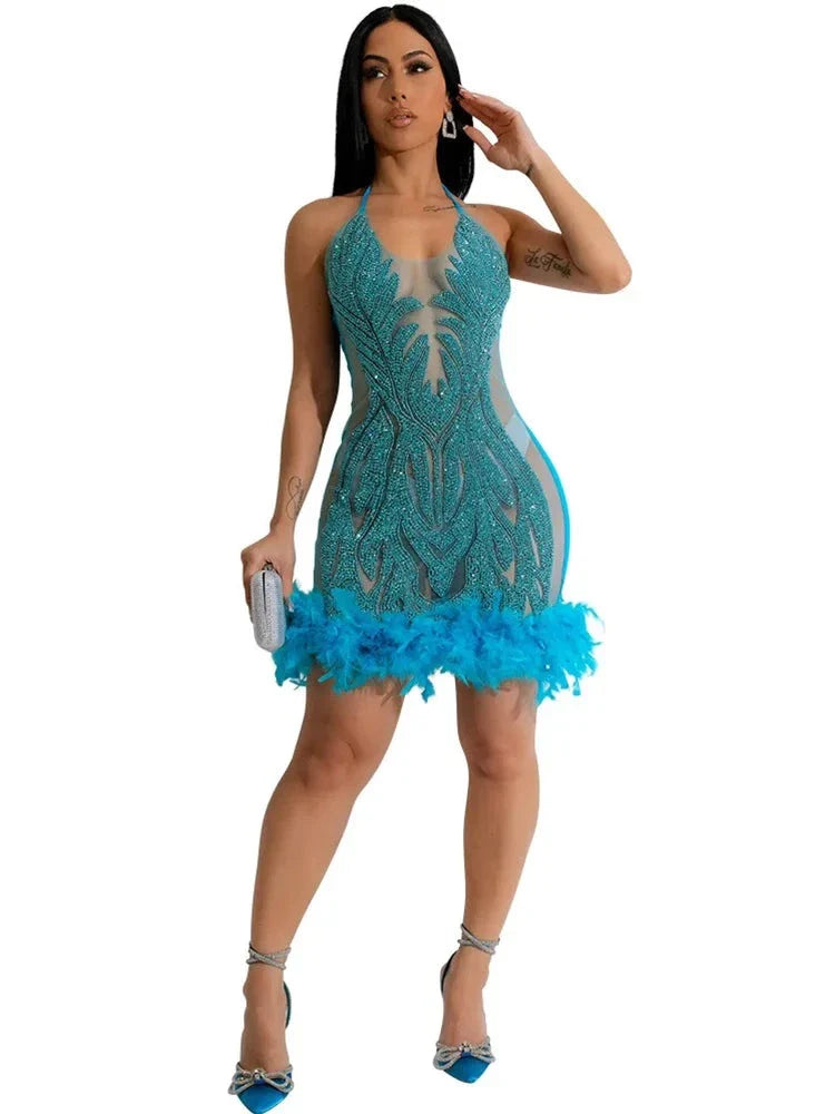 Elegant Luxury Sequins See Through Feather Mini Dress Celebrity Halter Backless Women‘s Sexy Birthday Party Nightclub Vestidos