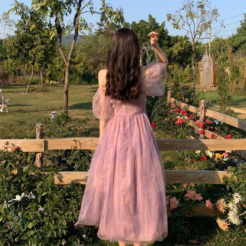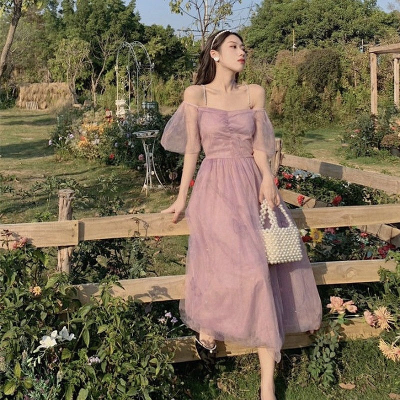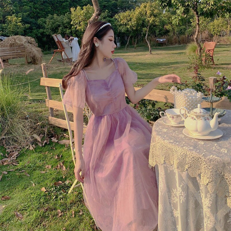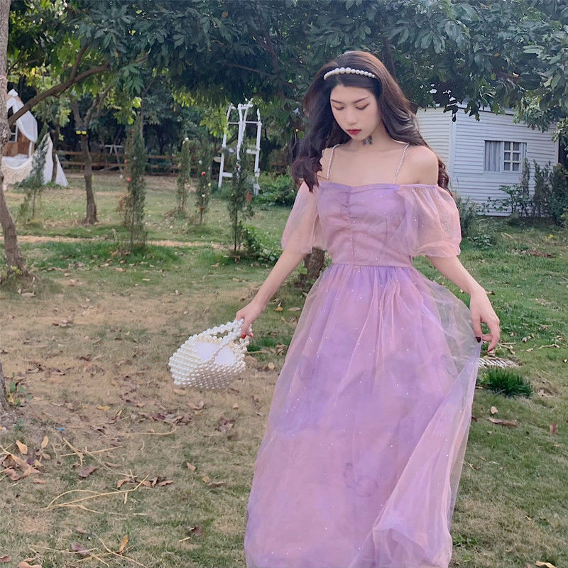 maoxiangshop Elegant Midi Summer Dress Women Mesh Korean Fairy Vintage Dress Female Design One-piece Sequins Strap Dress Ladies Clothing