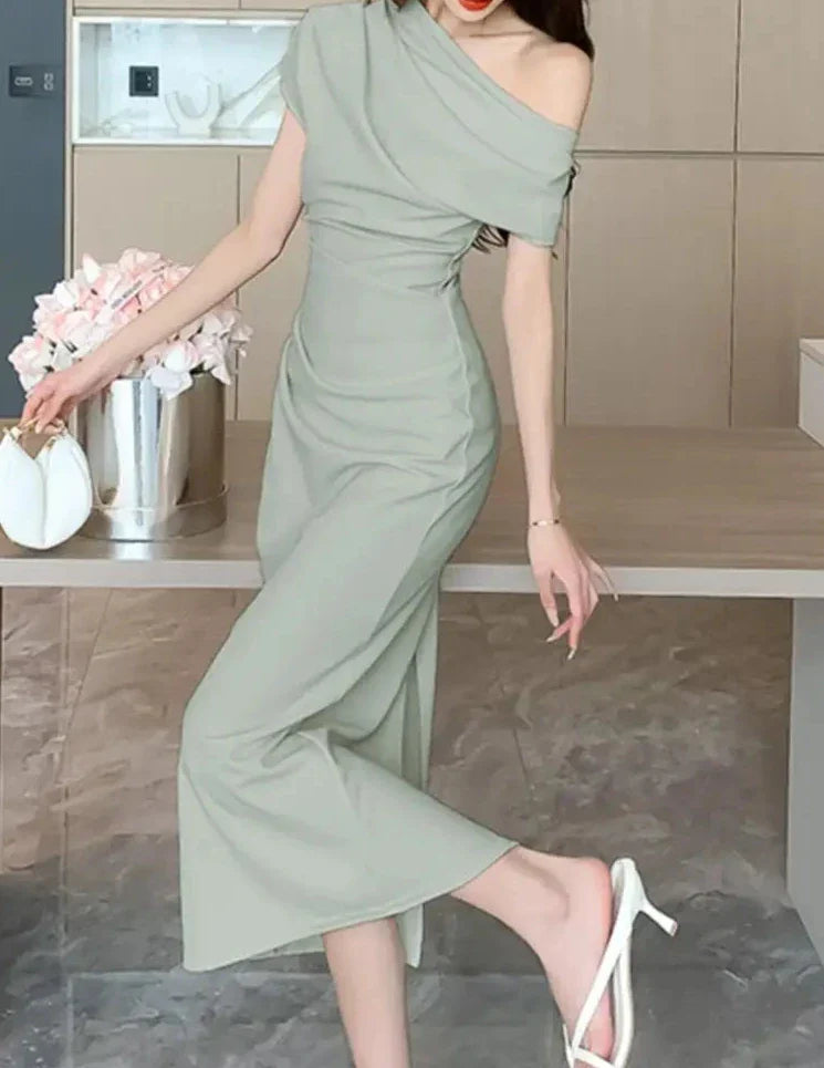 maoxiangshop Elegant Off Shoulder Evening Party Dresses Women Summer Fashion Slim One Piece Solid Vestidos Korean Graduation Robe Clothing