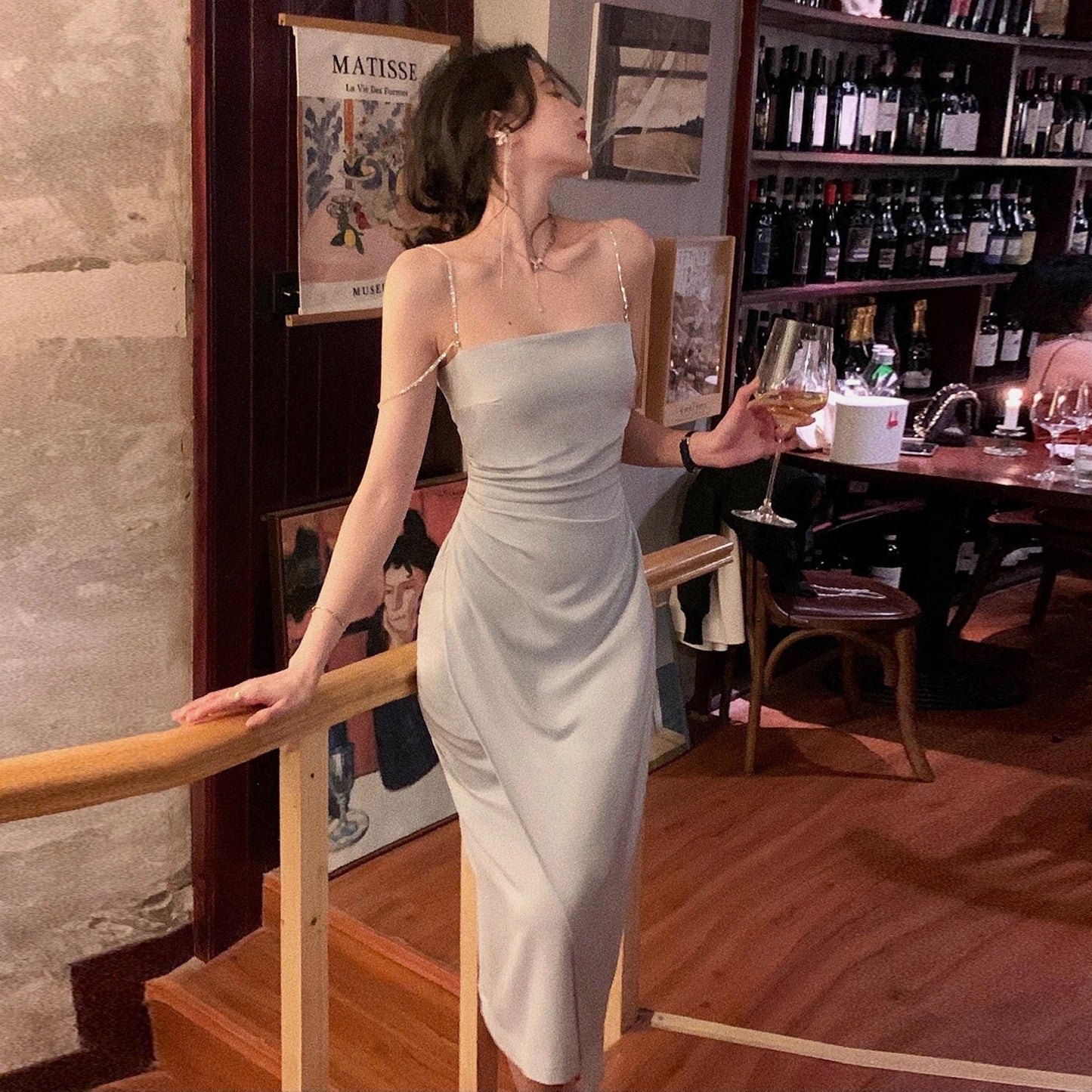 maoxiangshop Elegant Party Spaghetti Strap Midi Dresses for Women Summer Sexy Prom Evening Fashion Female Clothes Blue Folds Satin Dress
