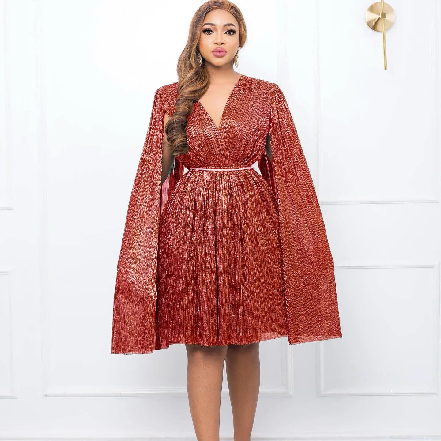 Elegant Ruched Formal Party Cloak Mini Dresses Women Sexy Pleated V Neck Slit Long Sleeve Club Night Out Wedding Dress