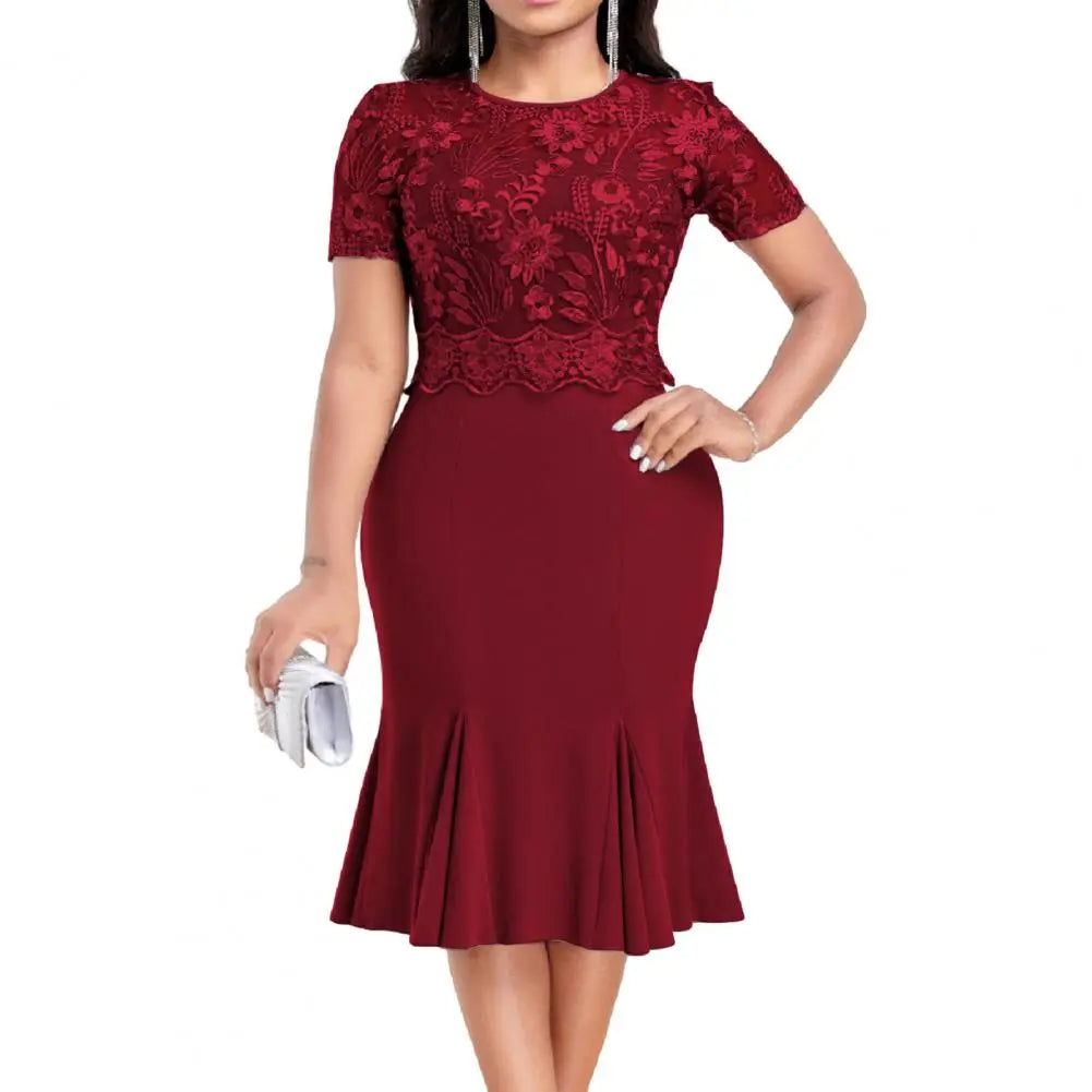 maoxiangshop Evening Party Dress Women Embroidery Lace Splice Dresses Short Sleeve High Waist Hip Wrapped Fishtail Gown Dress Formal