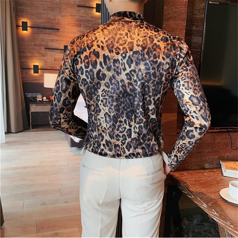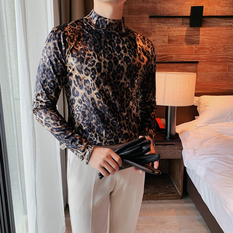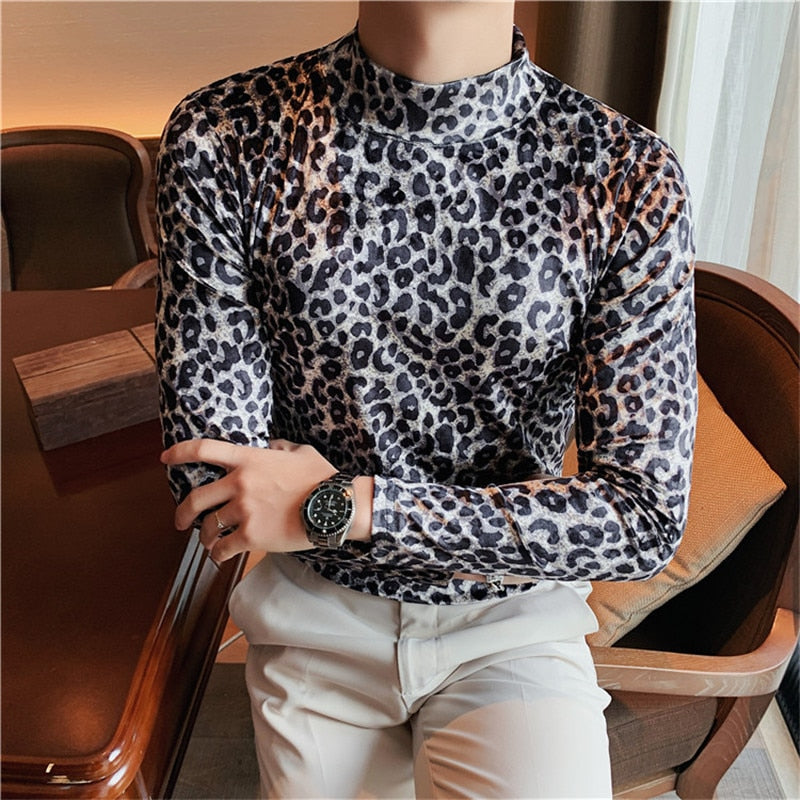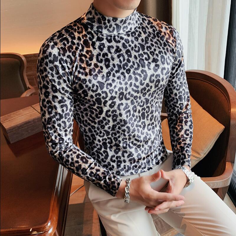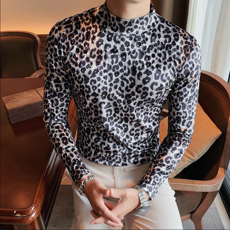maoxiangshop Flannel T-shirt Winter Men High Collar Pullover Fashion Leopard Slim Fit T-shirt Long Sleeved Velvet Casual Bottoming Shirt