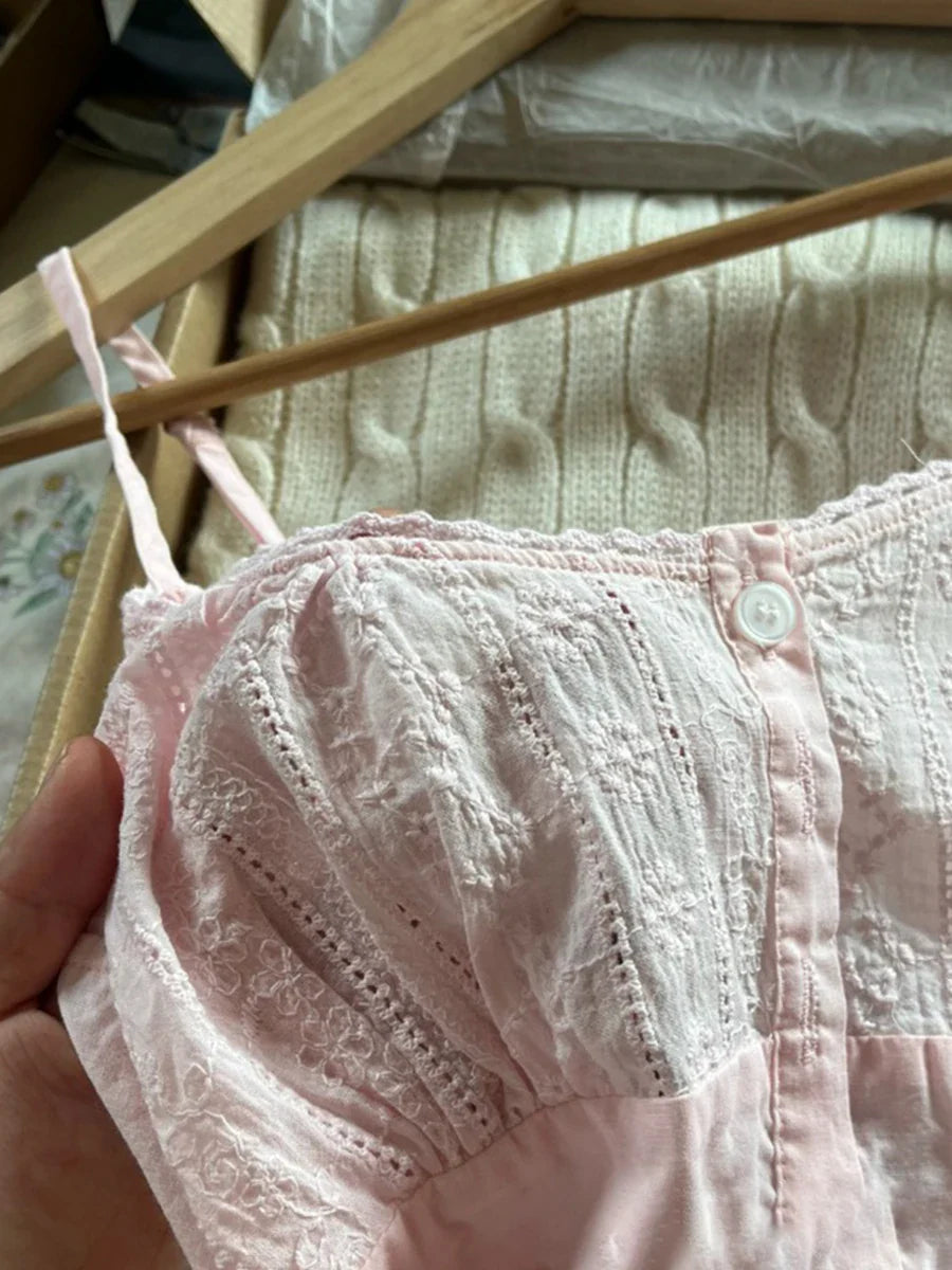 maoxiangshop Floral Embroidery Pink Mini Dress Woman Summer Buttons Ruffles Lace-up Sweet Short Dresses Casual Preppy Style Cotton Vestidos