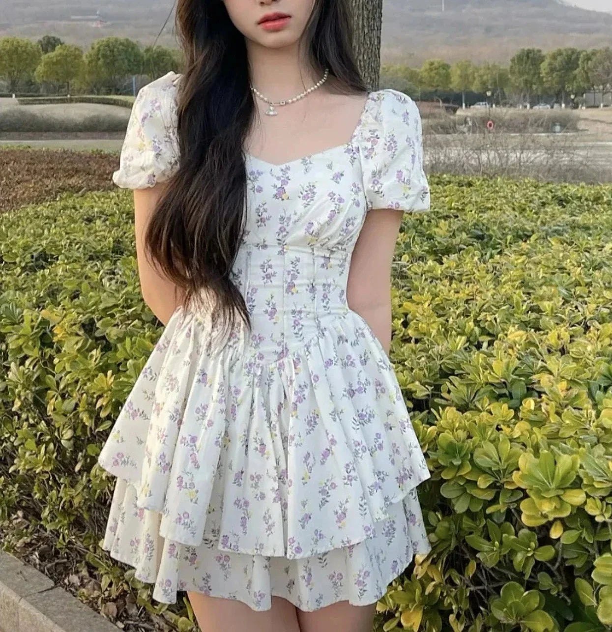 Preppy Style Dresses for Women Lovely Girls Fashion Floral Design Mini Sweet Chic Korean Young Summer Clothing All-match Casual