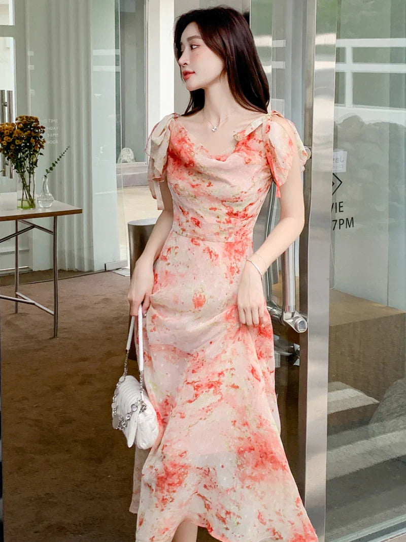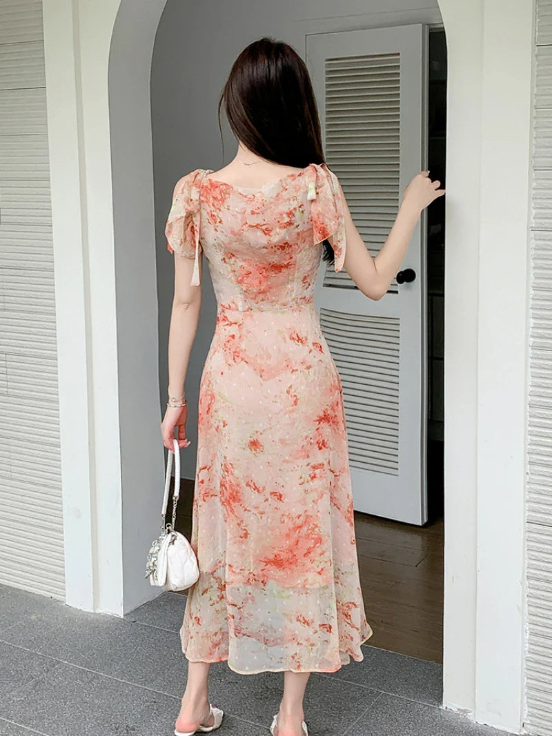 French Floral Suspender Chiffon Dress Seaside Holiday Beach Long Dress Summer Fairy Temperament Korean Women's New Chic