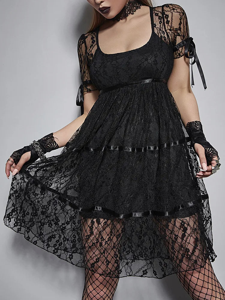 maoxiangshop Lace Mall Gothic Aesthetic Black Women Dresses Grunge See Through Sexy Puff Sleeve Mini Dress A-line Summer Partywear