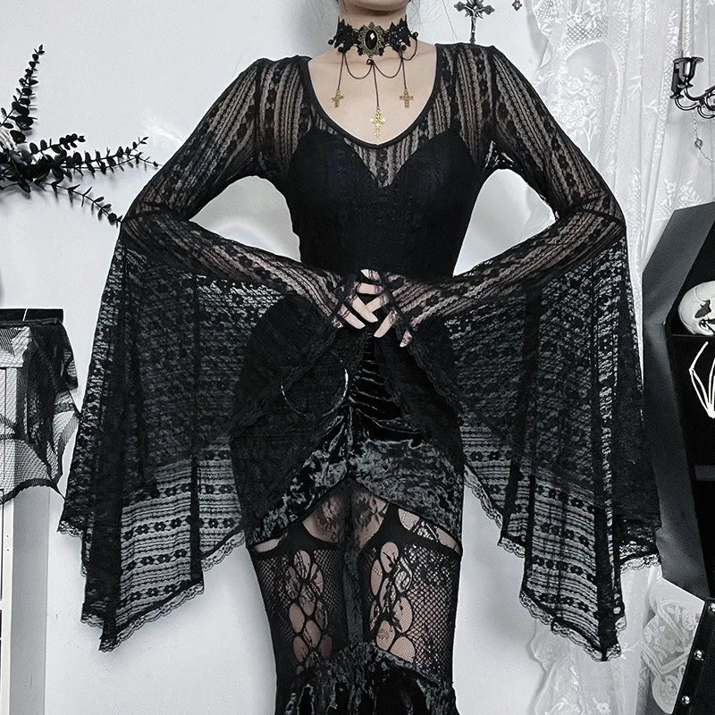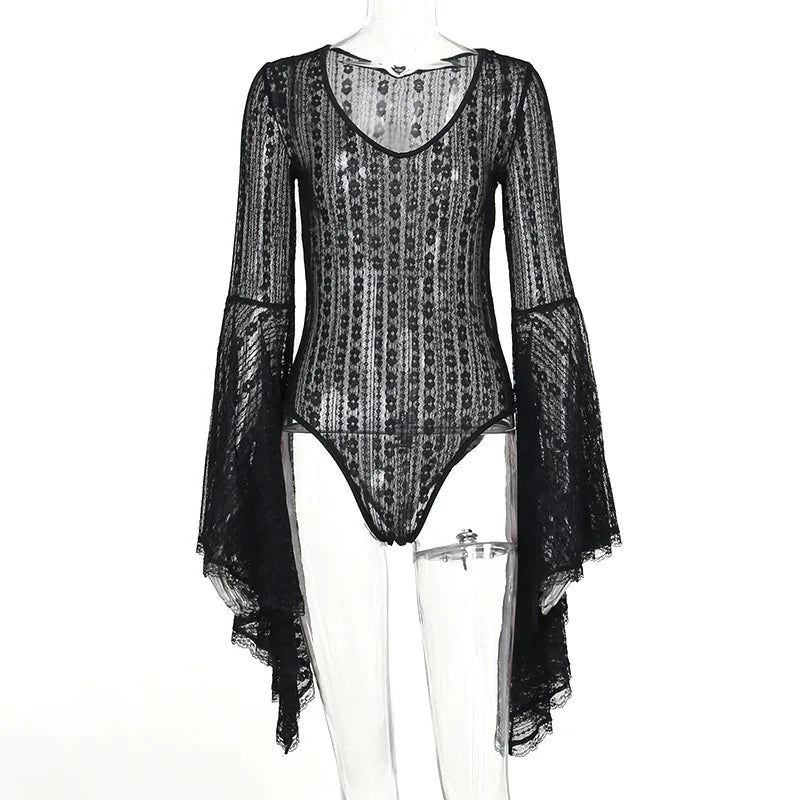 maoxiangshop Lace See Through Mall Gothic Aesthetic Bodysuits Flare Sleeve Grunge Sexy Women Tops Punk Bodycon V-neck Alt Bodysuit