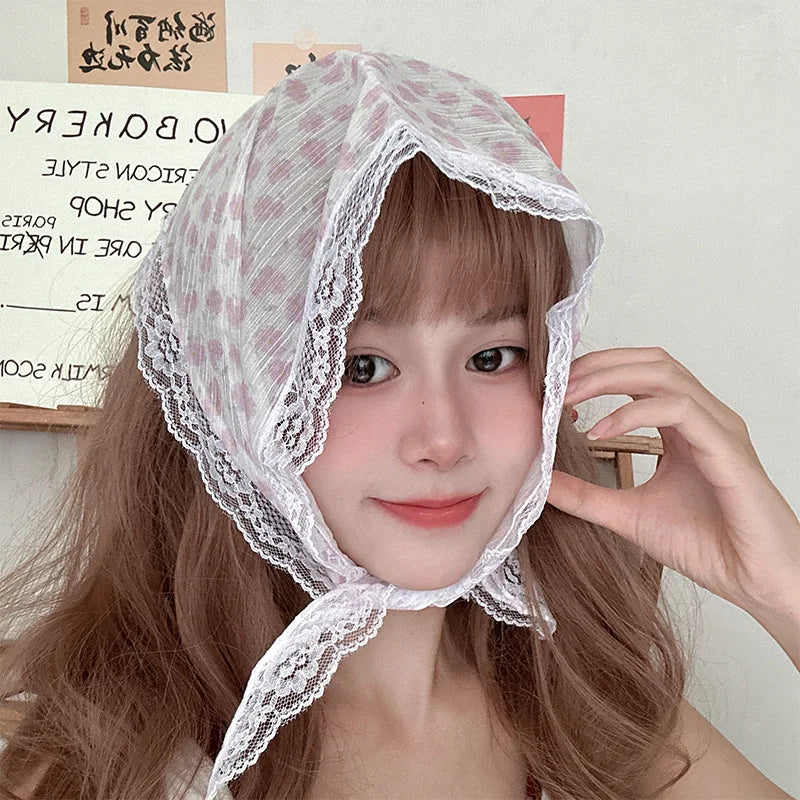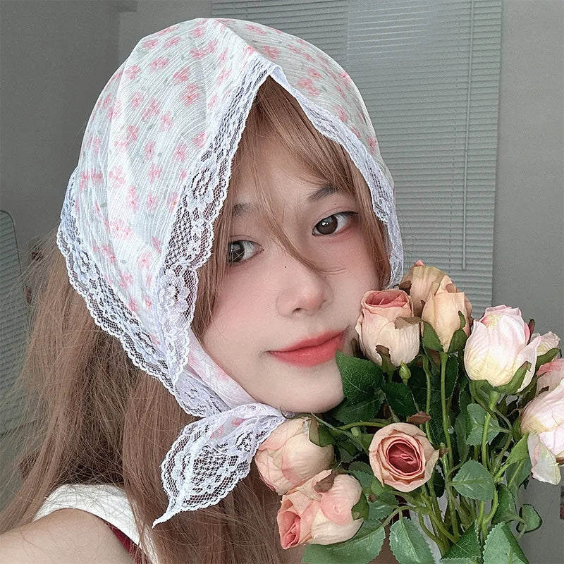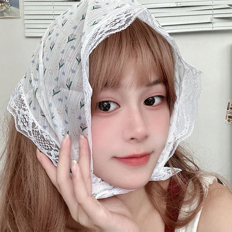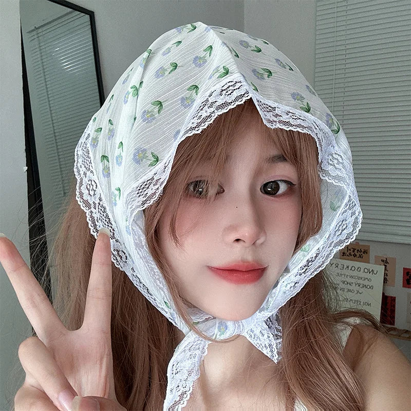 maoxiangshop Korean Lace Floral Hair Scarf Women Retro Triangle Hair Band Strap Hair Bag Headscarf Photo Headband Turban Accessorie