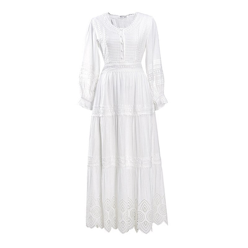 Lace Elegant Women's Dress Spring Hollow Button V Neck Lantern Sleeve White Long Dresses Boho Casual Holiday Vestidos