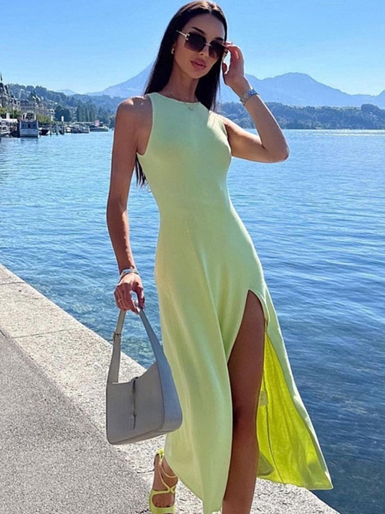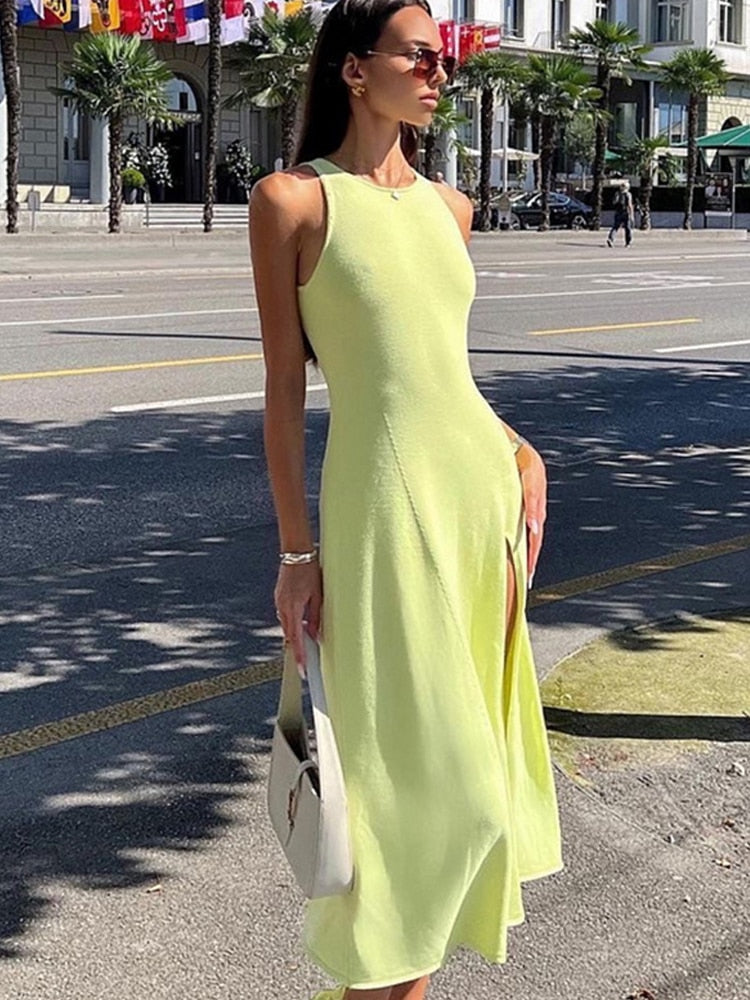 maoxiangshop Knitting Split Women Dress Sexy Slim Sleeveless Hip Package Midi Dresses Female Spring Summer Fashion Solid Ladies Vestido