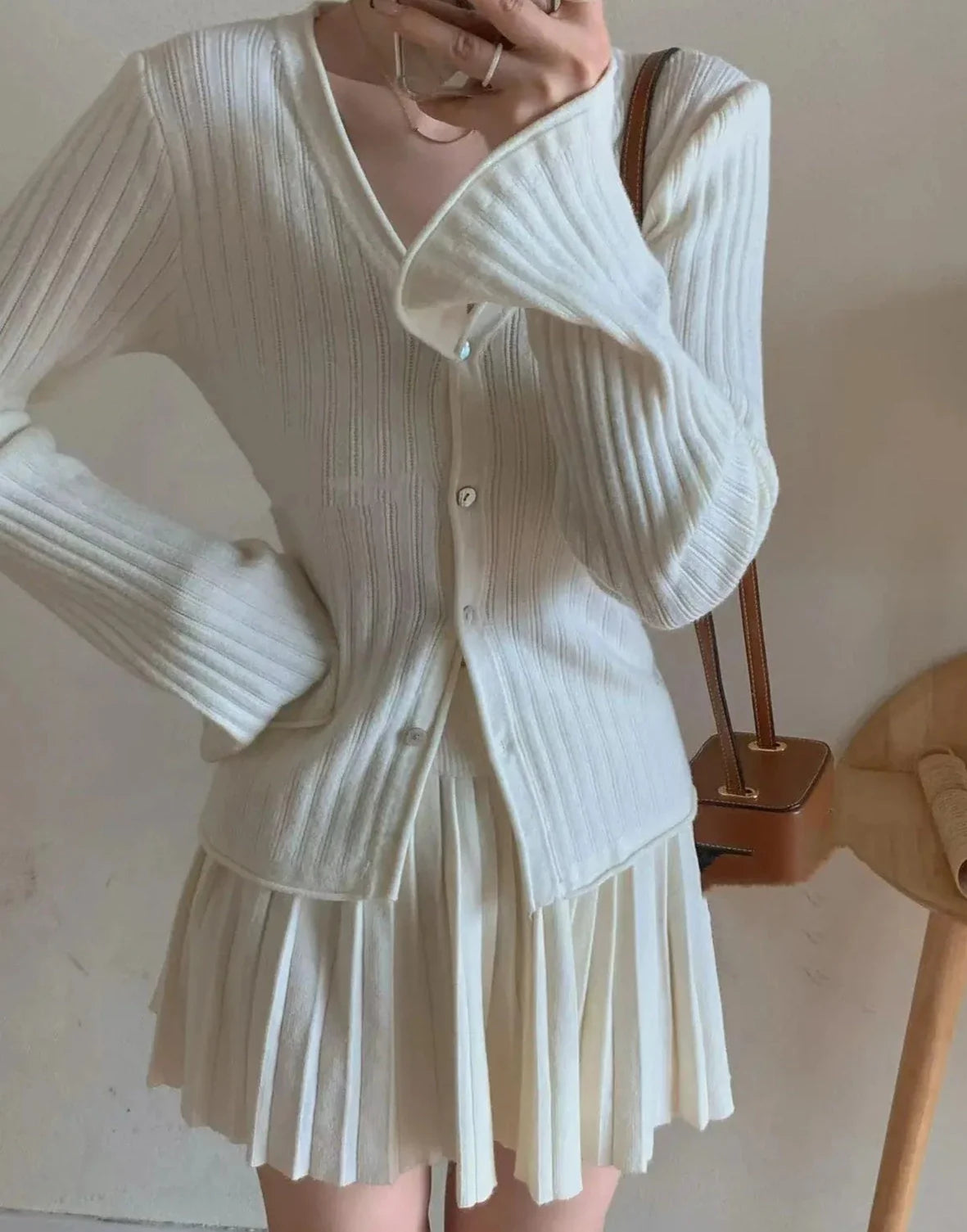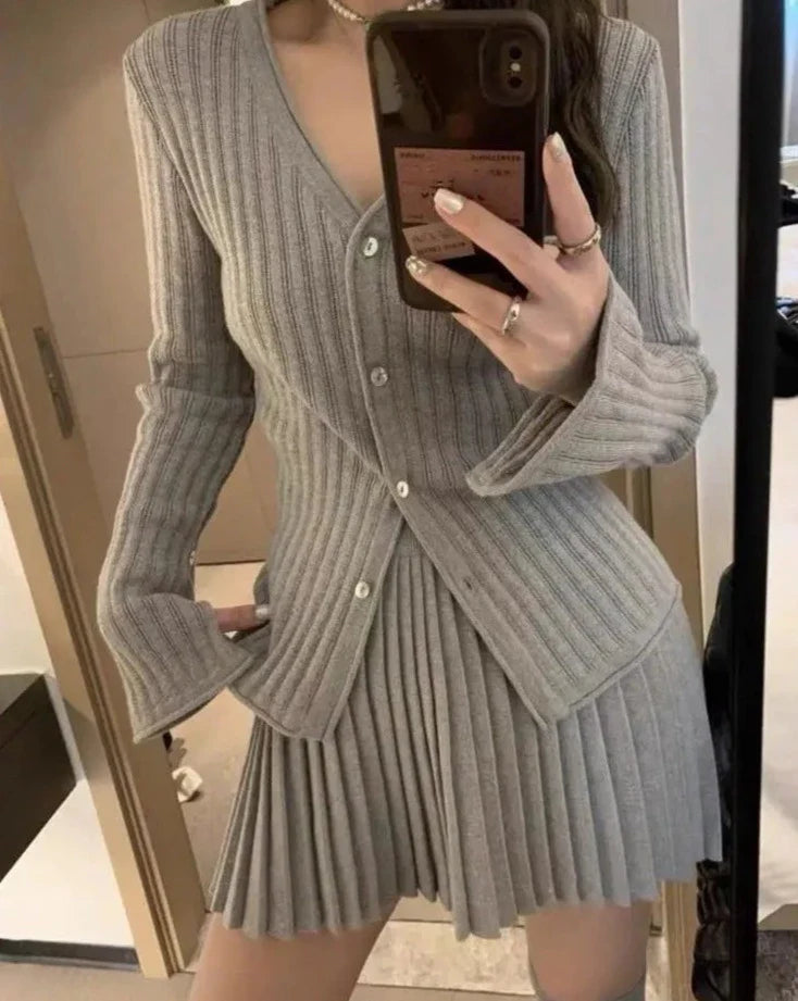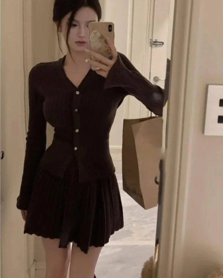 maoxiangshop Korean Elegant Pleated Skirt 2 Piece Set Slim Button Knitted Cardigan High Waist Mini Skirt Outfits Women Autumn OL Suit Clothes