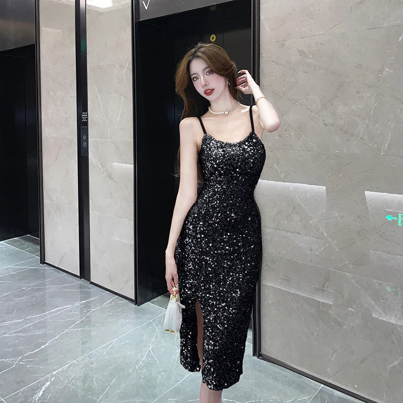 maoxiangshop Korean Sequins Midi Dresses for Women Summer Elegant Party Sexy Sleeveless Slim Prom Female Clothes Wedding Evening Dress