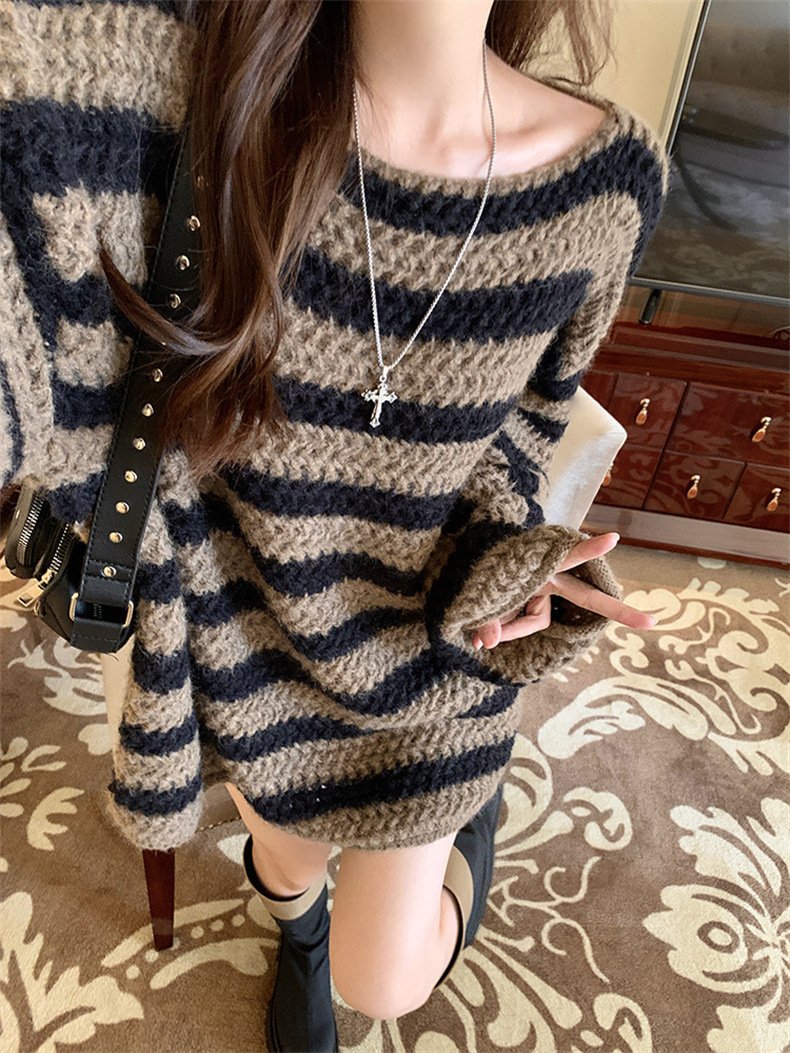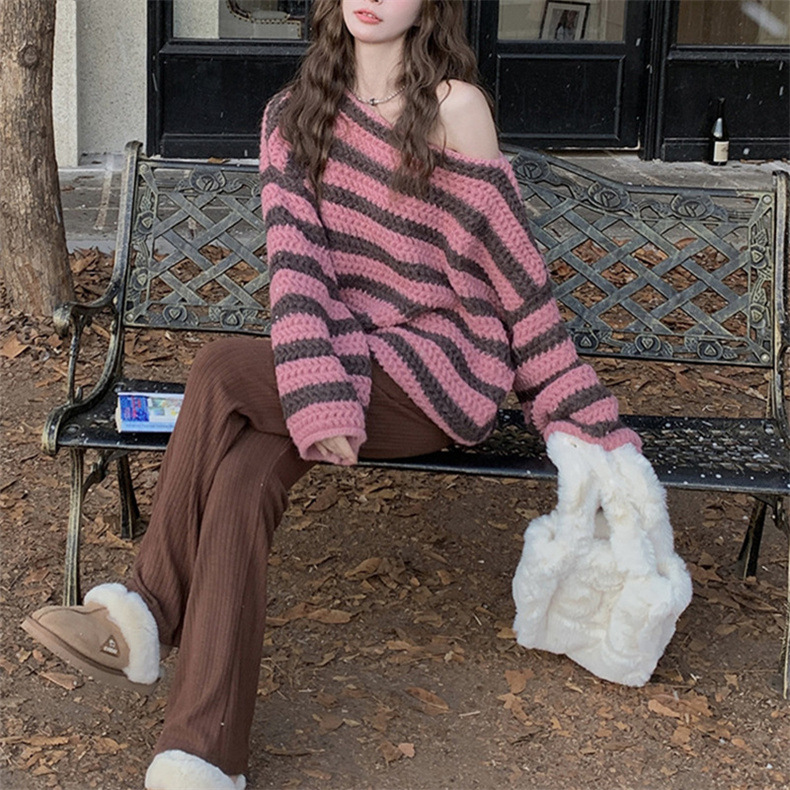 maoxiangshop-shop fall outfits women aesthetic Autumn and Winter New Retro Striped off-Neck Sweater Loose Lazy Style Age-Reducing Versatile Pullover Sweater for Women