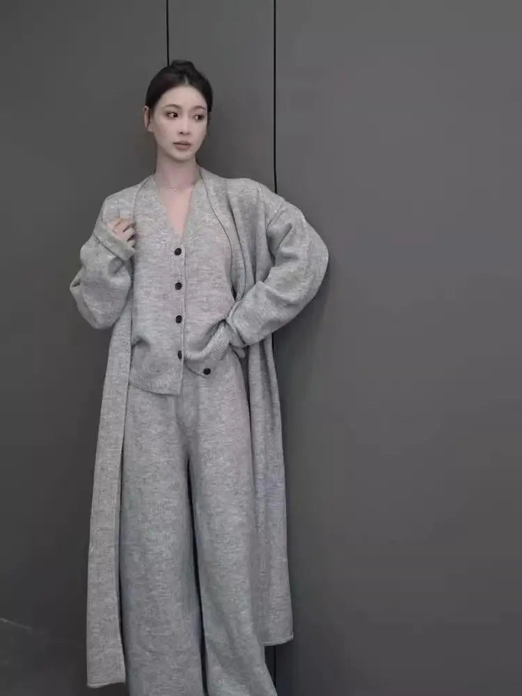 New Autumn Winter Women Knitted Three Piece Set Cardigan Sweater + Single Breasted Vest Tops And Wide Leg Pants Fashion Elegant