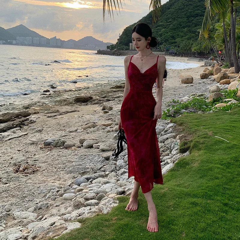 Sexy Sleeveless Red Spaghetti Strap Midi Dresses for Women Summer New French Vintage Fashion Party Backless Female Clothing