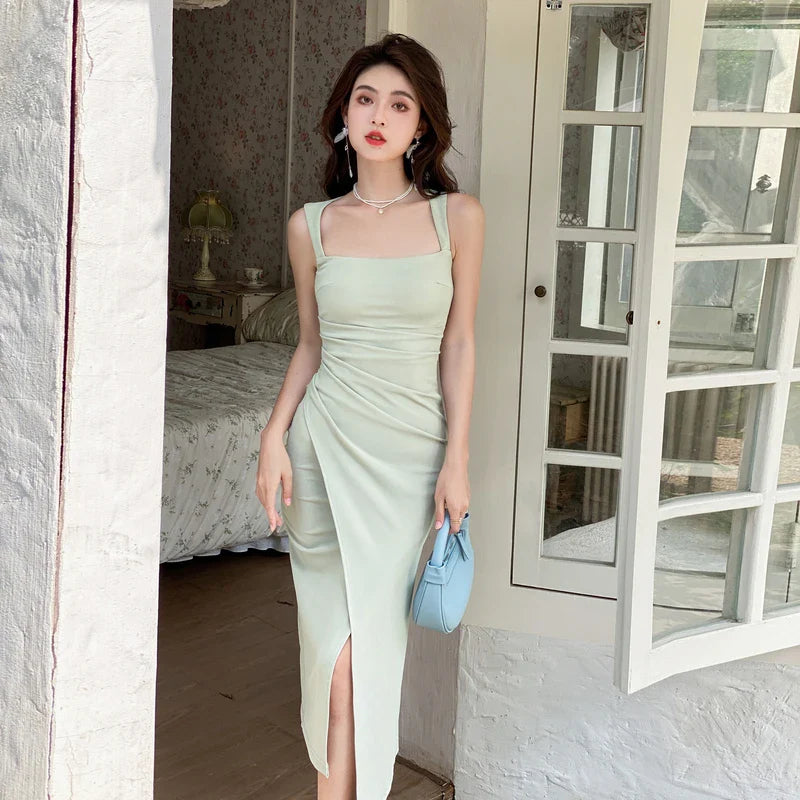Sexy Square Collar Midi Dresses Women New Summer Sleeveless Splitting Evening Female Clothes Korean Elegant Party Sundress