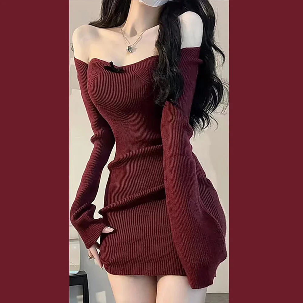Spicy Girls Sexy Knitted Dress Square Collar Christmas Red Knitted Skirt Autumn and Winter Underlay Skirt Knitted Wrap Hip Skirt