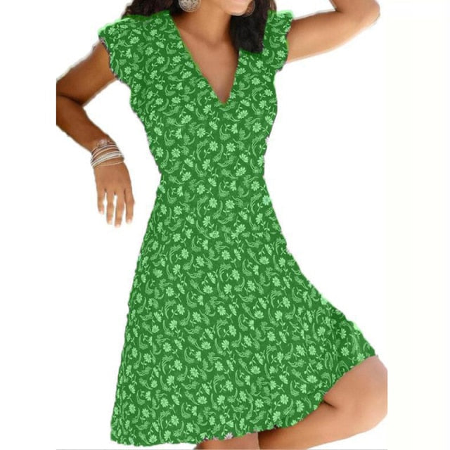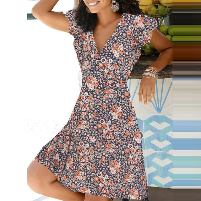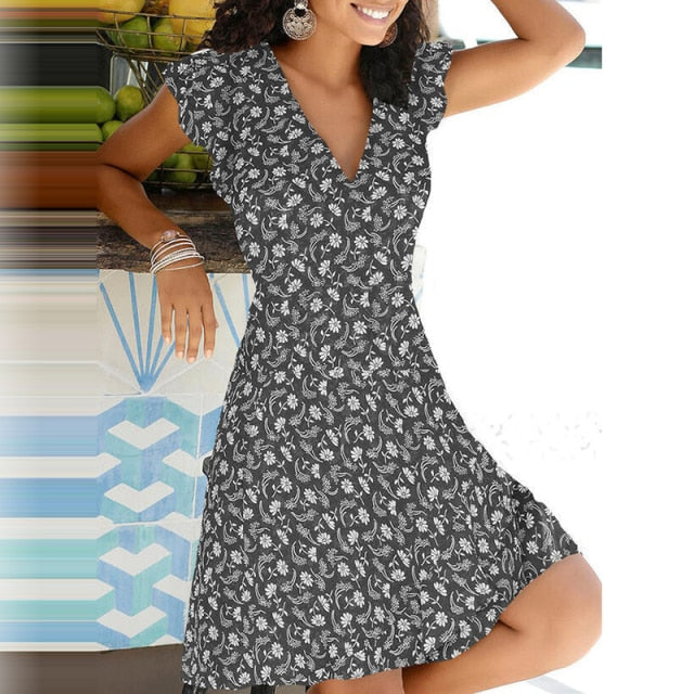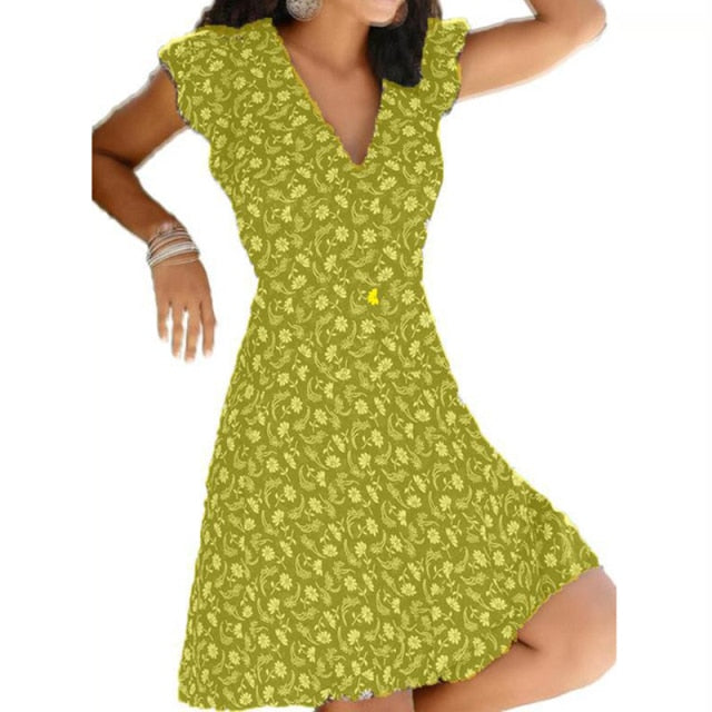 Spring Summer New Casual Floral Print V Neck Pullover A-line Dress Fashion Short Sleeves Elegant Office Lady Party Vestidos