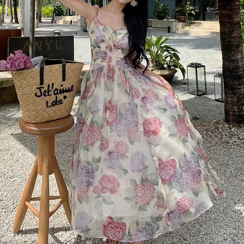 maoxiangshop Summer Chiffon Beach Maxi Dress Women Fashion Print Floral Backless Bandage Slip Dress Elegant Evening Party Fairy Dresses