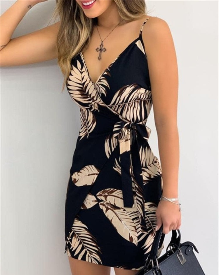 Summer New V-Neck Print Lace Up Wrap Sexy Dress for Women