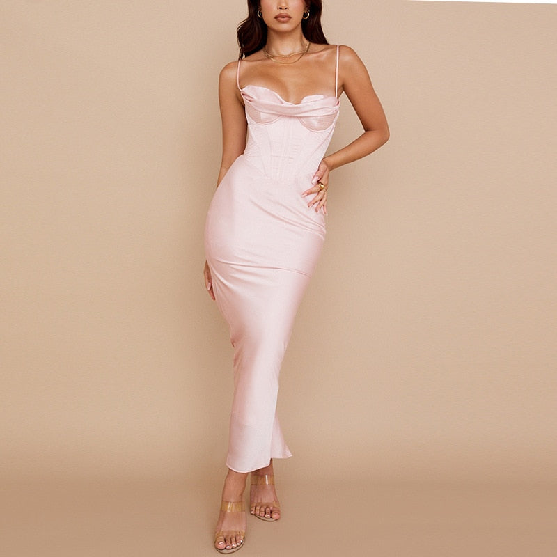 Summer Satin Maxi Bodycon Dress Women Party Dress New Arrivals Pink Fishbone Dress Celebrity Evening Club Night Dresses