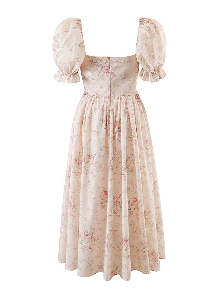 Summer Women Front Lace Up Floral Print Long Dress Elegant Square Neck Female Big Swing Holiday Party Dresses Prairie Chic Robe