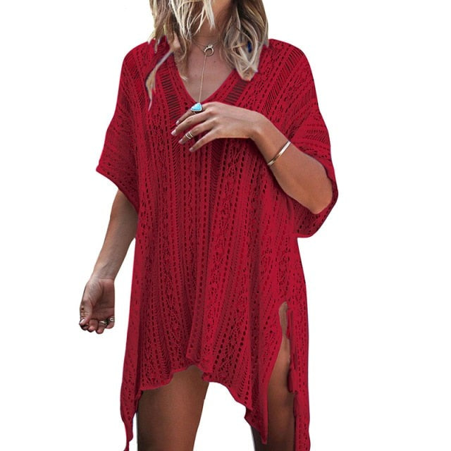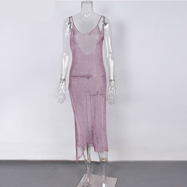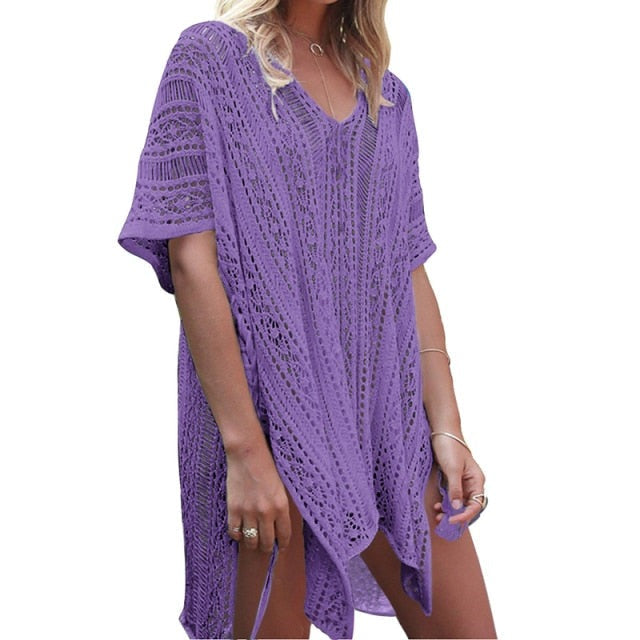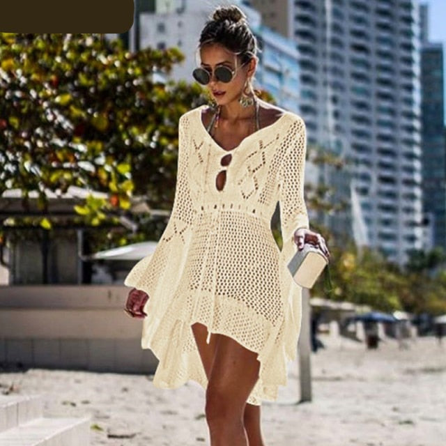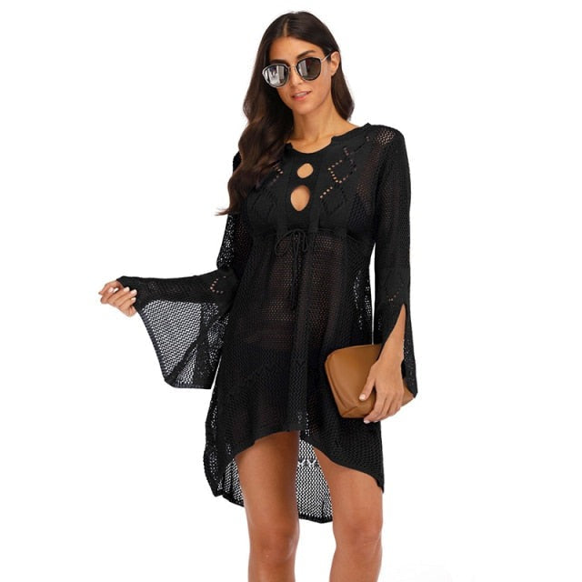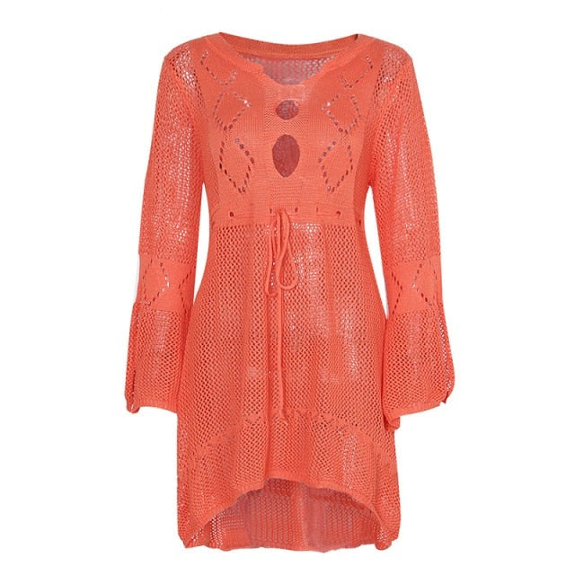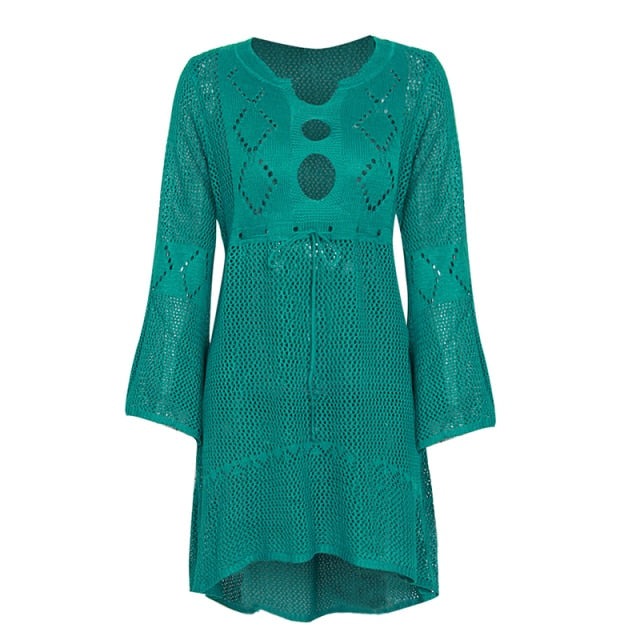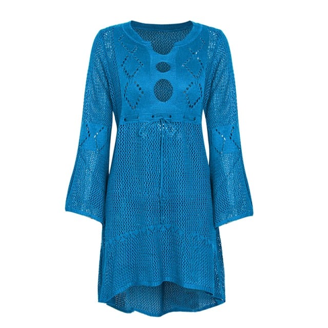 maoxiangshop Backless Sexy Knitted Dress Women Summer Long Sleeve Open Back See Through Beach Cover Mini Dress Femme Clubwear