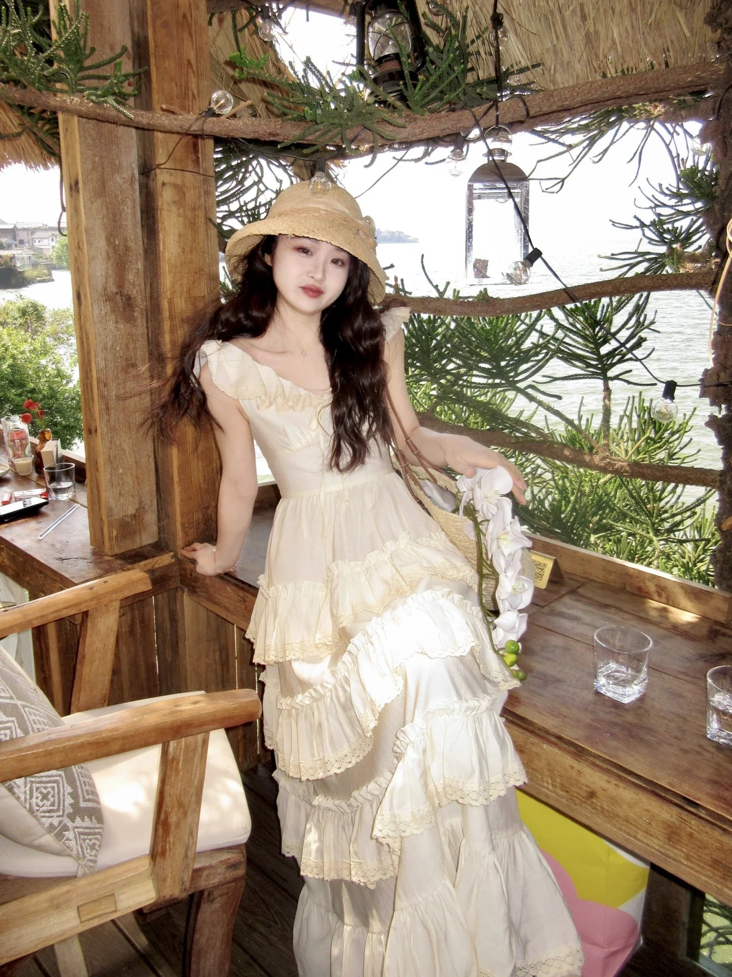 Woman French Elegant Midi Dress Even Party Holiday Fairy Cake Dress Casual Beach Pure Color Korean Fashion Dress Slim Design
