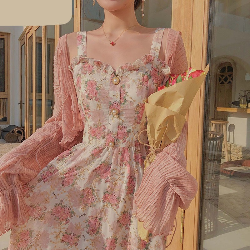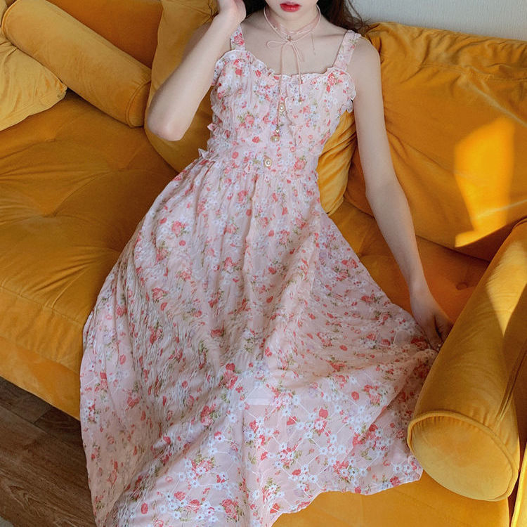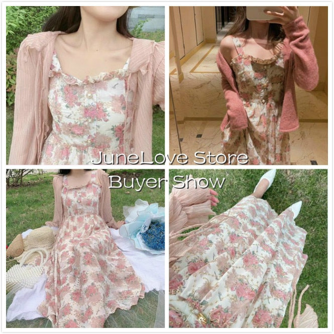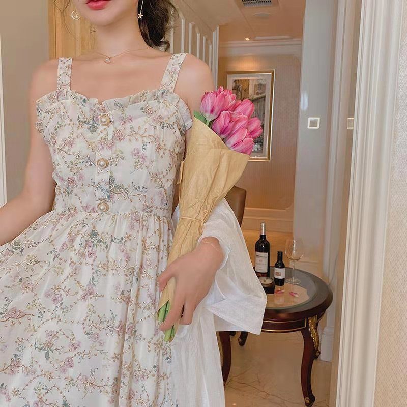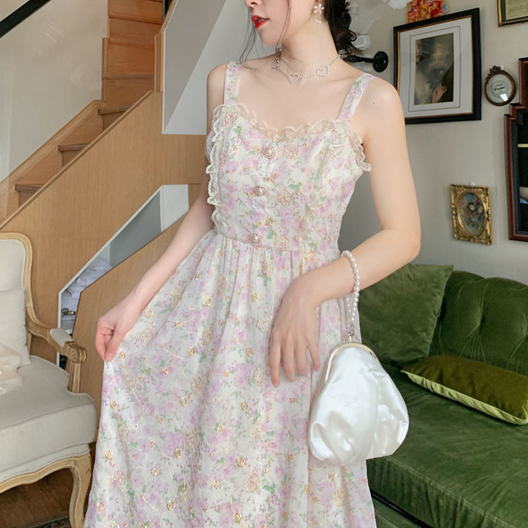 maoxiangshop Women Summer Print Floral Midi Dress Vintage Franch Style Female Strapless Party Dress Casual Holiday Lady Boho Vestido