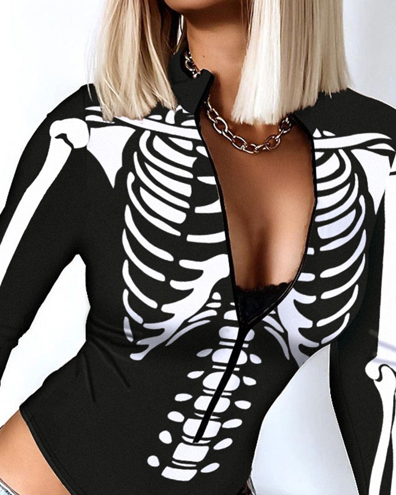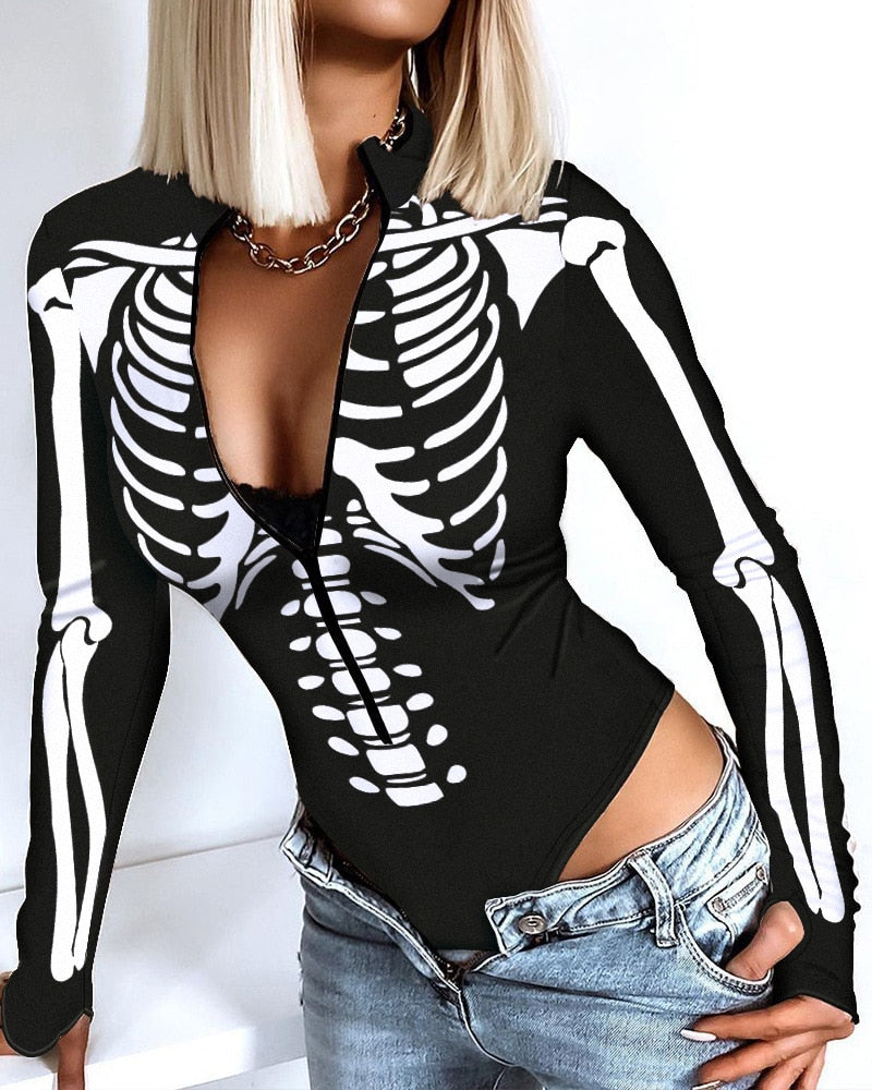 maoxiangshop Women Top Romper V Neck Skulls Slim Casual Halloween Skeleton Print Zip Front Long Sleeve Bodysuit Sexy Bodysuits
