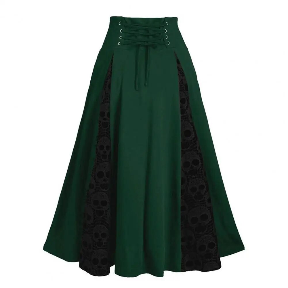 Women Halloween Skirt High Waist Vintage Vampires Cosplay Medieval Skull Print A-line Loose Hem Lace Up Adjustable Waist Lace Patchwork Lady Midi Skirt