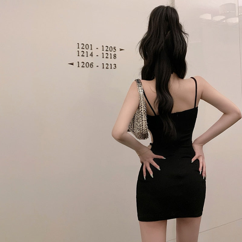 maoxiangshop Women Y2K Sexy Club Hollow Out Dress Chain Halter Neck Backless Sleeveless Black Skinny Bag Hip Slip Mini Dresses