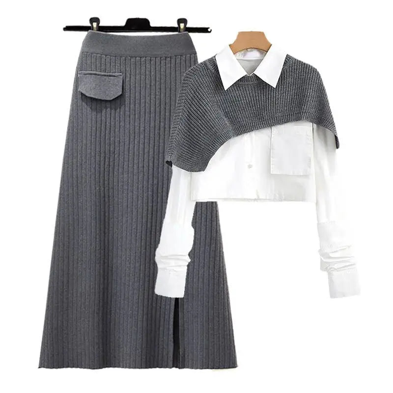 maoxiangshop Women's Autumn Dress Sets Female Loose Knit Shawl+Long sleeve Shirt+High Waist Knitted Half Skirt Three Piece Set Korean Fashion