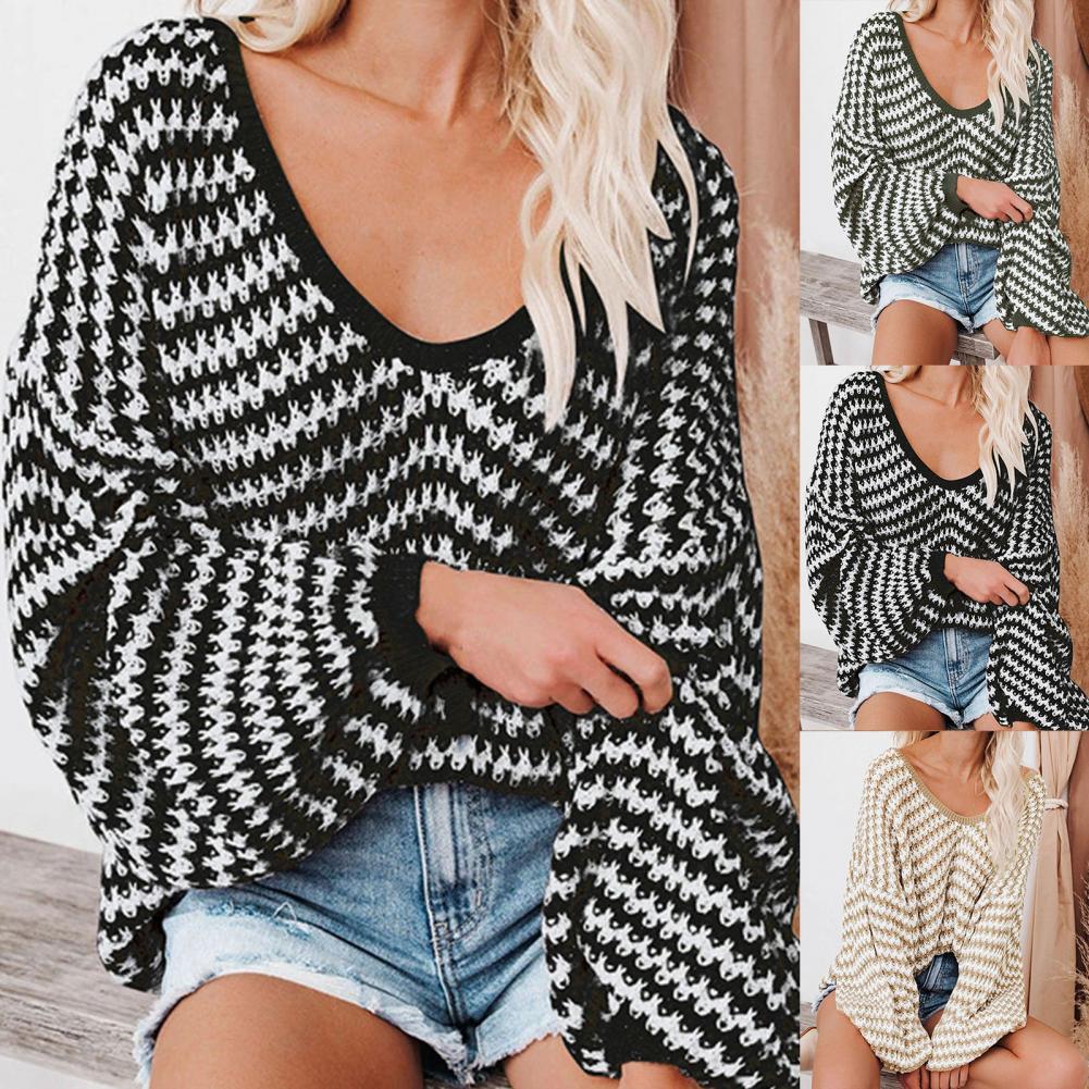 Women's Sweater Loose Striped Knitted Thick Knit Wide Neck Sweater Long Sleeve Loose Off Shoulder Jumper for Autumn Winter