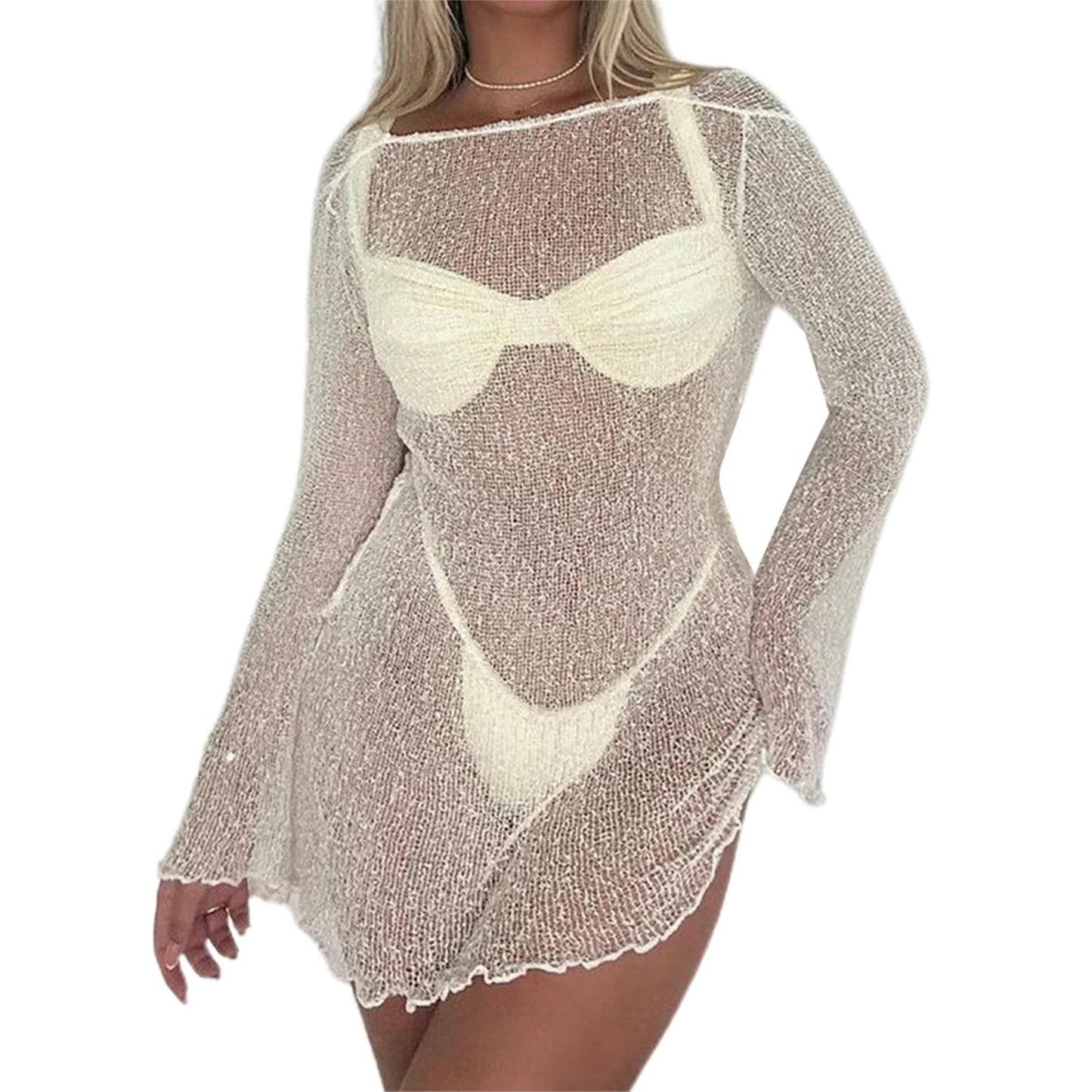 Women Bikini Cover-Ups Sexy Ladies See-Through Long Sleeve Backless Beach Knitted Mini Dress Swimwear Sunscreen Dresses