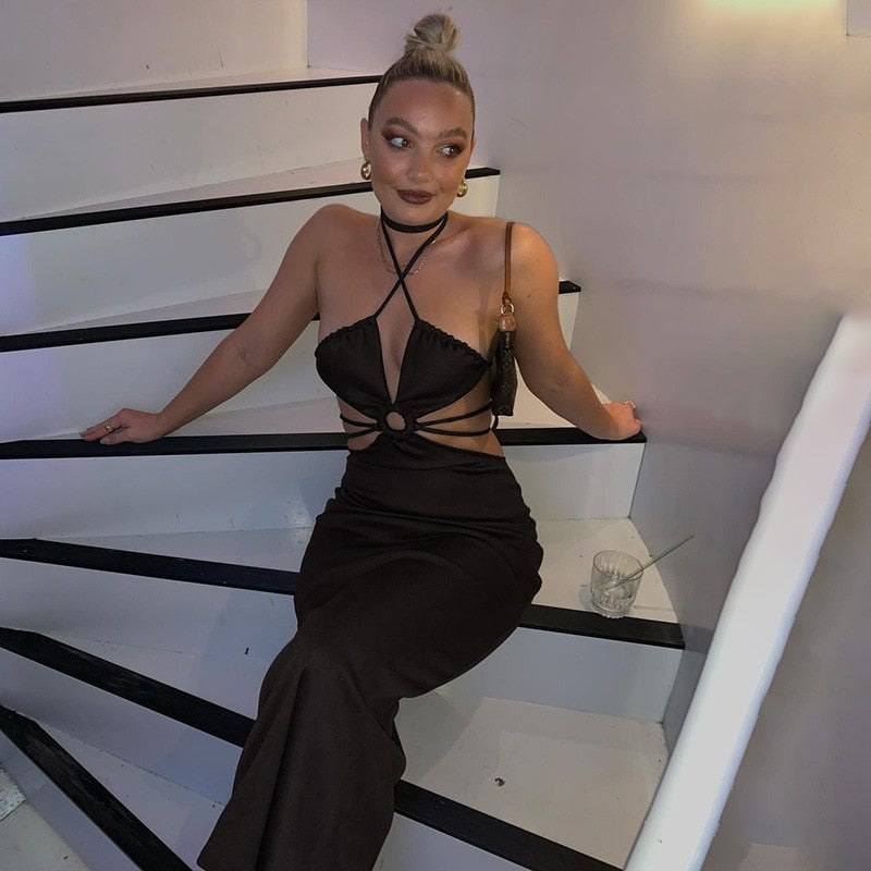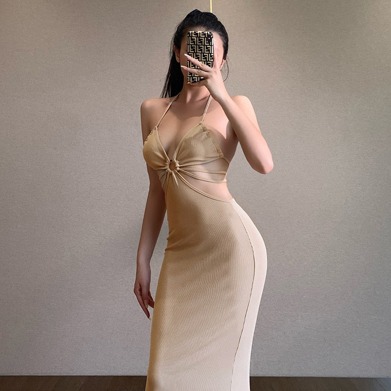 maoxiangshop Summer New Ladies Halter Neck Hollow Dress Sexy Fashion Temperament Suspenders Fishtail Long Skirt Party High Street