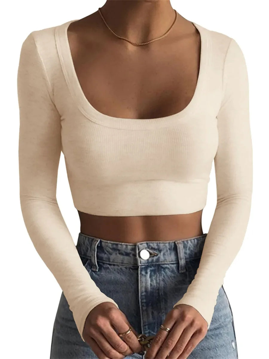 2023 O Neck Ribbed Knitted Long Sleeve Shirts Women Sexy Cropped Tops y2k Casual Skinny Slim Basic T-shirts Tee Tops Black White