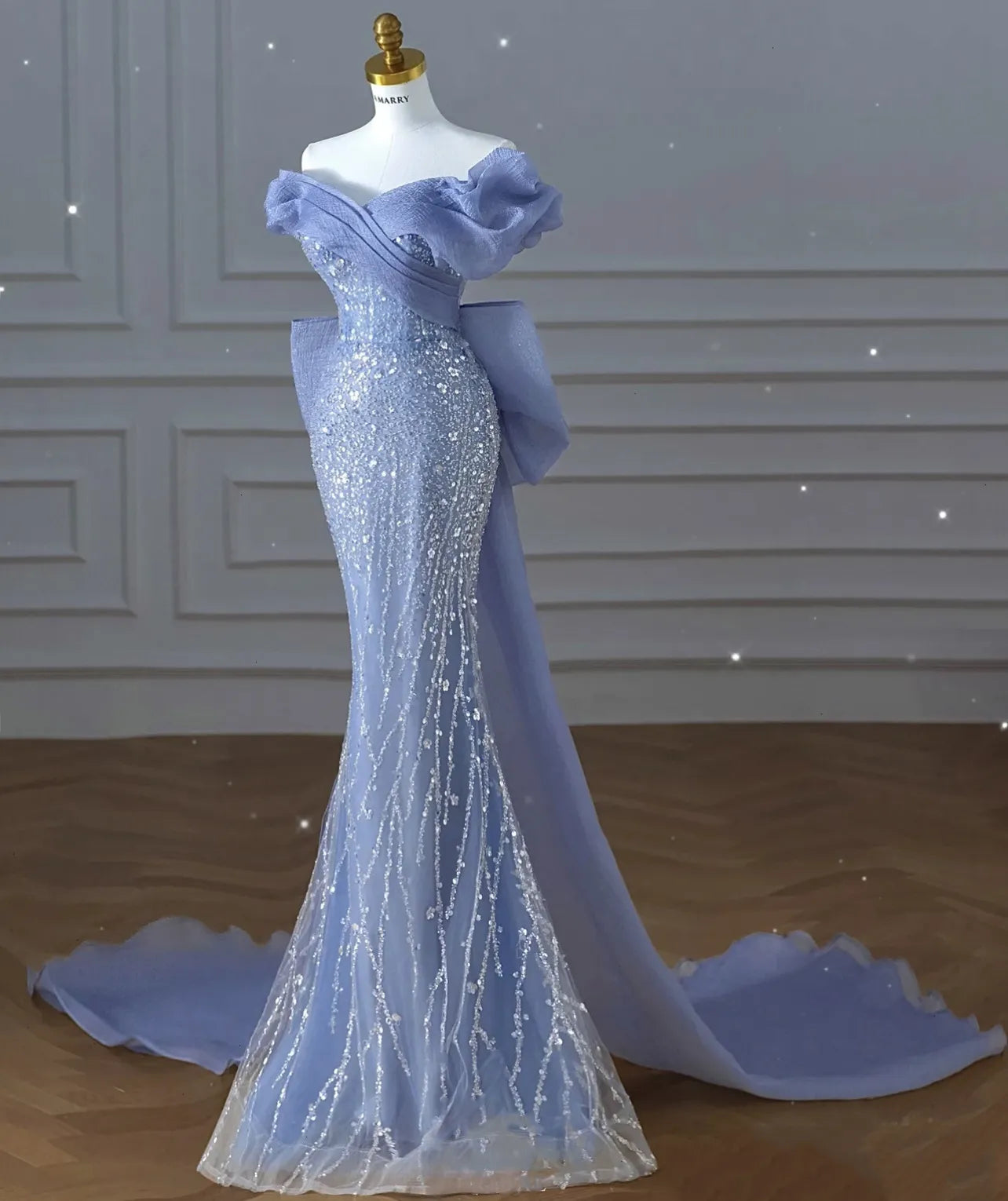 maoxiangshop Off the Shoulder Sequin Beaded Mermaid Formal Gown Custom Made Bowknot Back Blue Prom Dress for Women