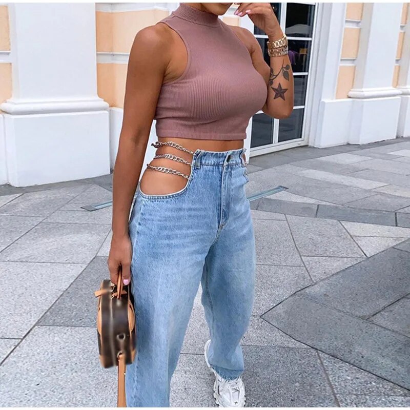 2023 Women Summer Sexy High Waist Jeans Washed Chain Straight Side Hollow Patchwork Blue Long Pants Zipper Pocket Denim Trousers
