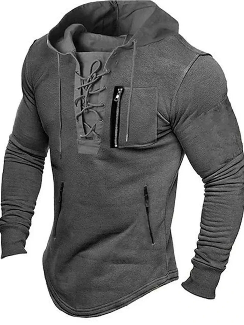 maoxiangshop Men Autumn Spring Top Lace Up Drawstring Solid Color Long Sleeve Zipper Pockets Pullover Streetwear Men Mid Length Hoodie