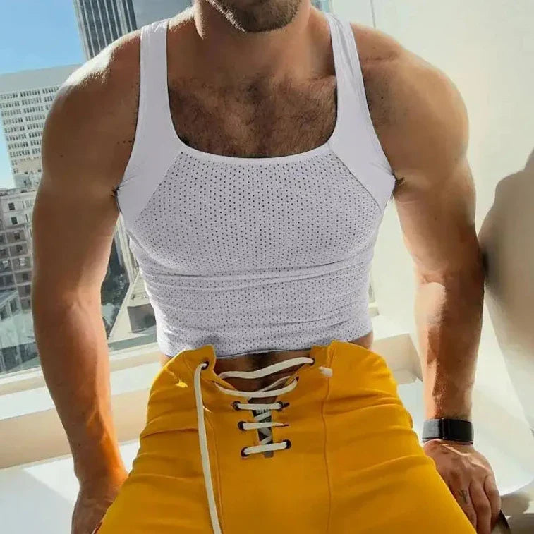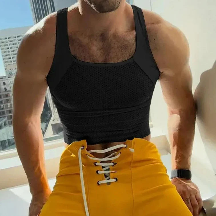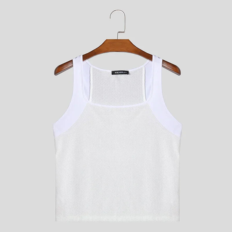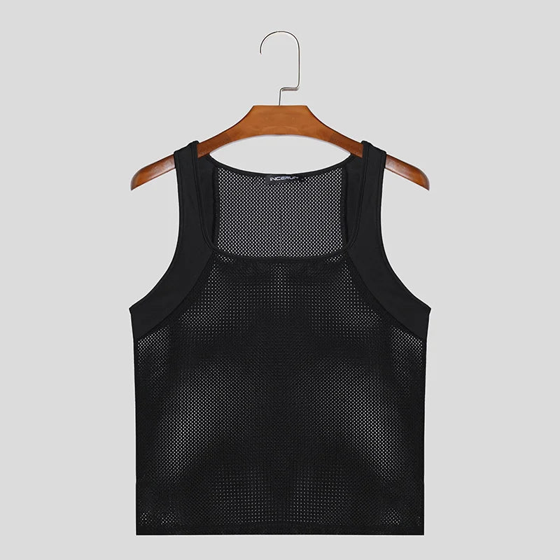 Men Tank Tops Patchwork O-neck Sleeveless Skinny Male Vests Streetwear Hollow Out Summer Fashion Men Clothing S-5XL